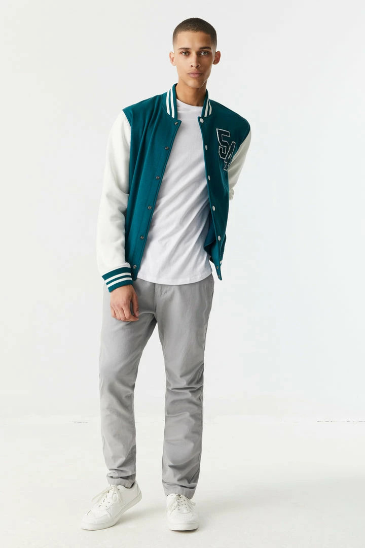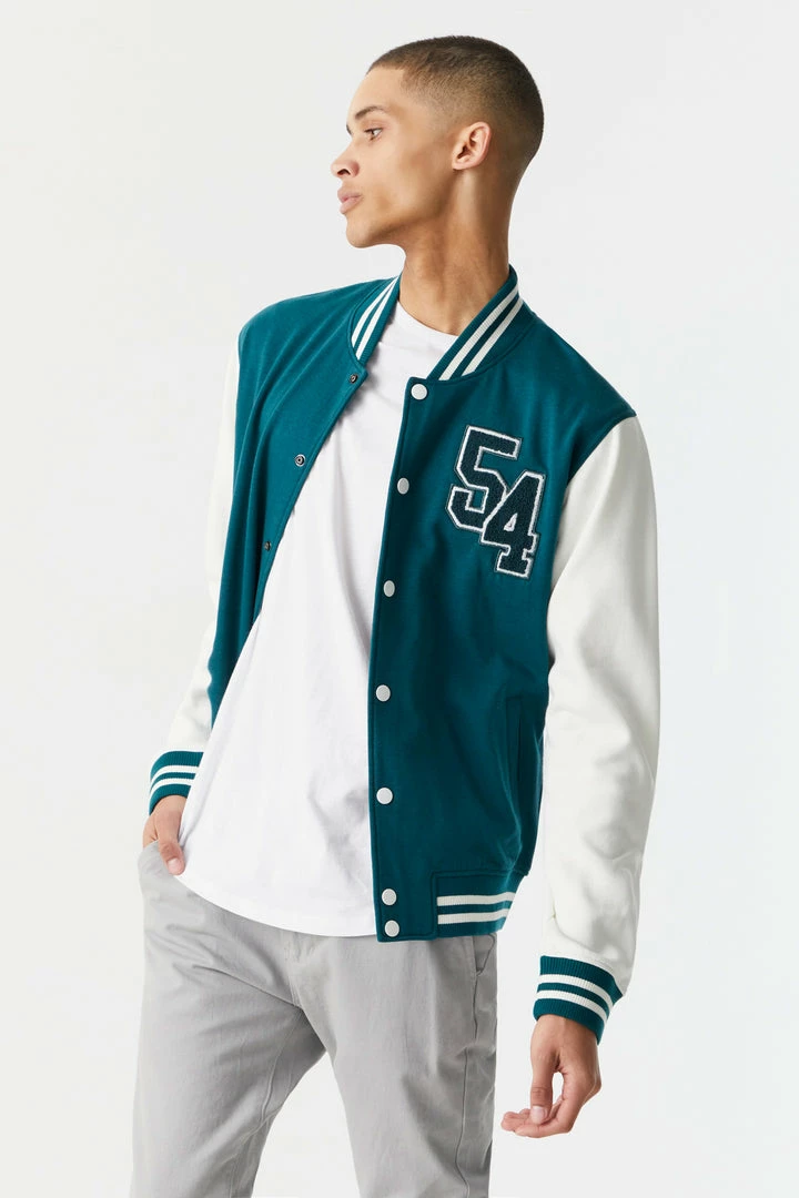 A classic look that will have you feeling like prom king! This bomber features button-up front, contrast hem, colour block sleeves and 54 graphic.