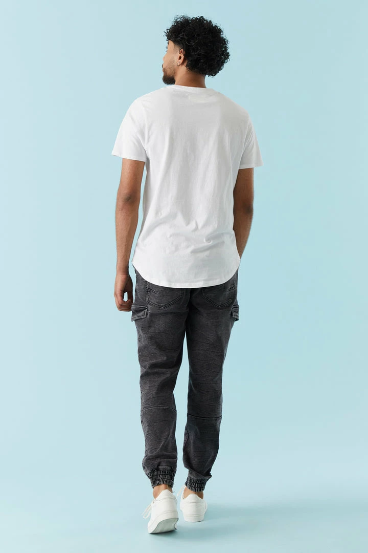 Get the look of denim with the comfort of a sweatpant in these cargo joggers. This jogger features black wash, four pockets, self-tie waist and cinched ankles.