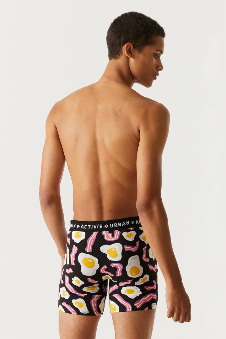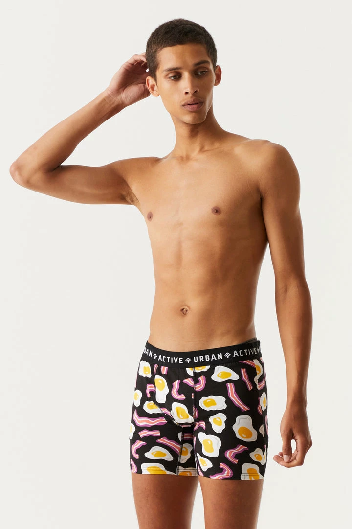 Like a good breakfast, these boxers are the base for a phenomenal day! This set features two elastic waist boxers, one with bacon and egg print and one solid.