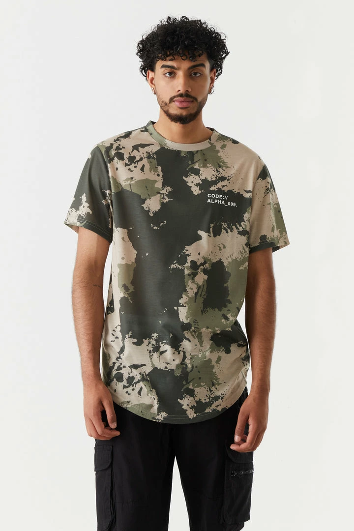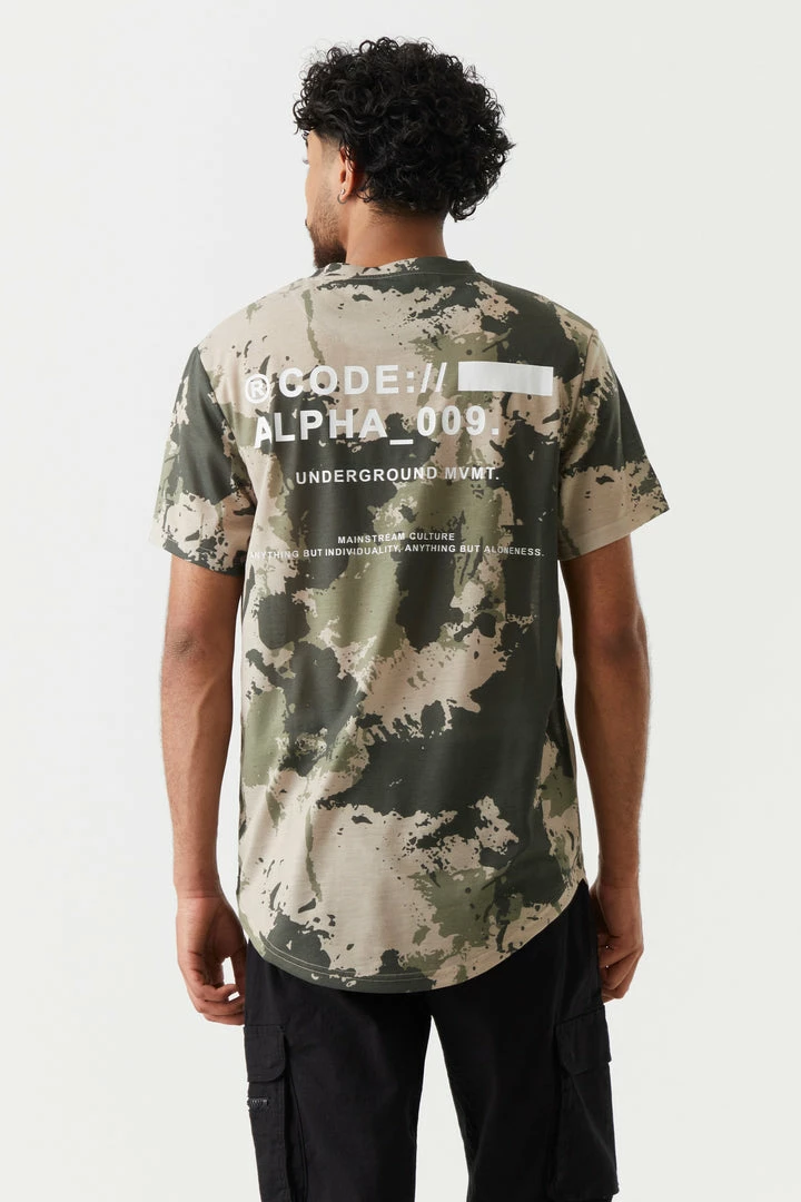 Set your sights high and step-up your streetwear game with this edgy tee. This t-shirt features crew neckline, short sleeves, Code Alpha graphic and camo print.