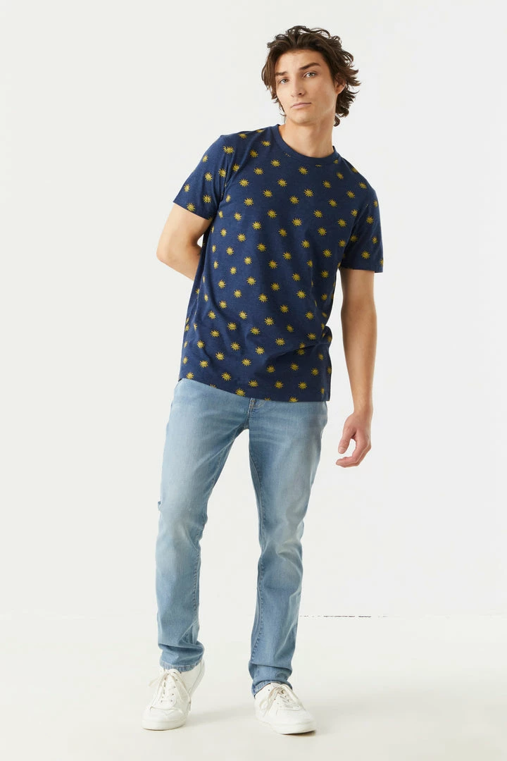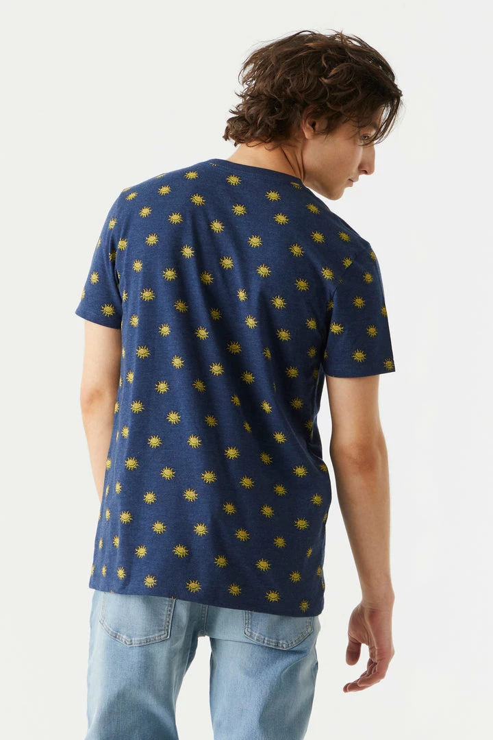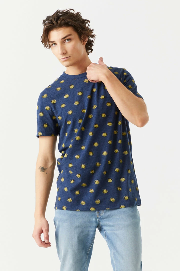 Grab your sunnies, catch some rays and get ready for brighter days! This t-shirt features crew neckline, ditsy trippy sun print and short sleeves.