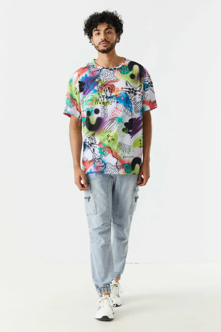 Take this stand-out street art tee out for a stroll and embrace the edgier side of life. This t-shirt features crew neckline, short sleeves and all over graffiti print.