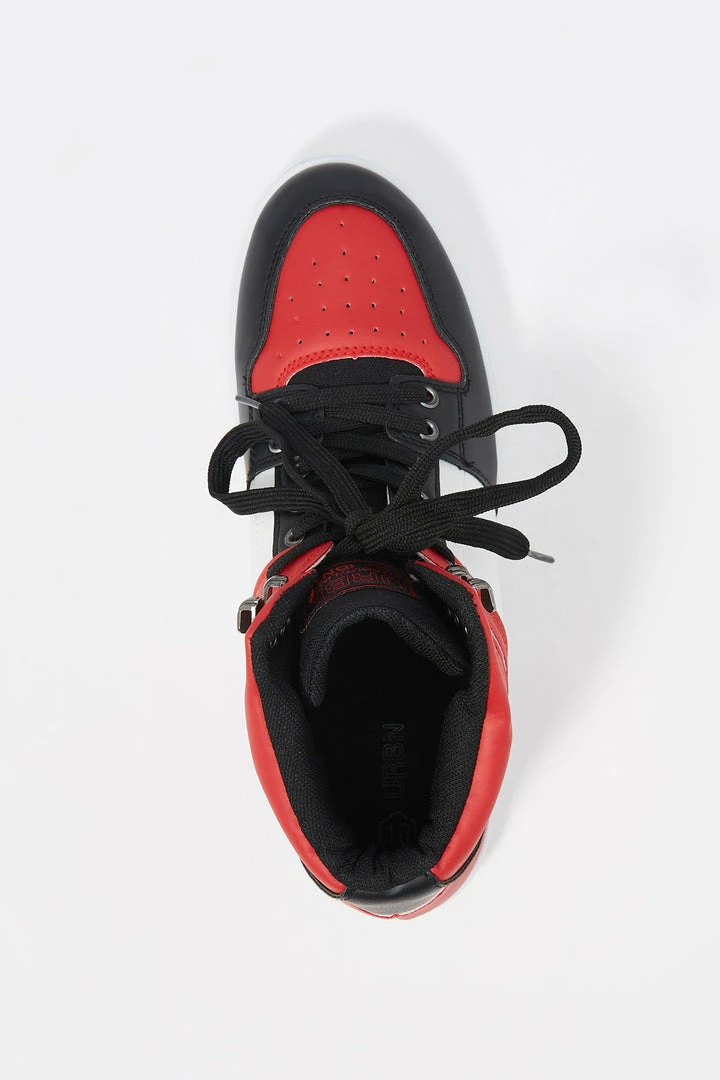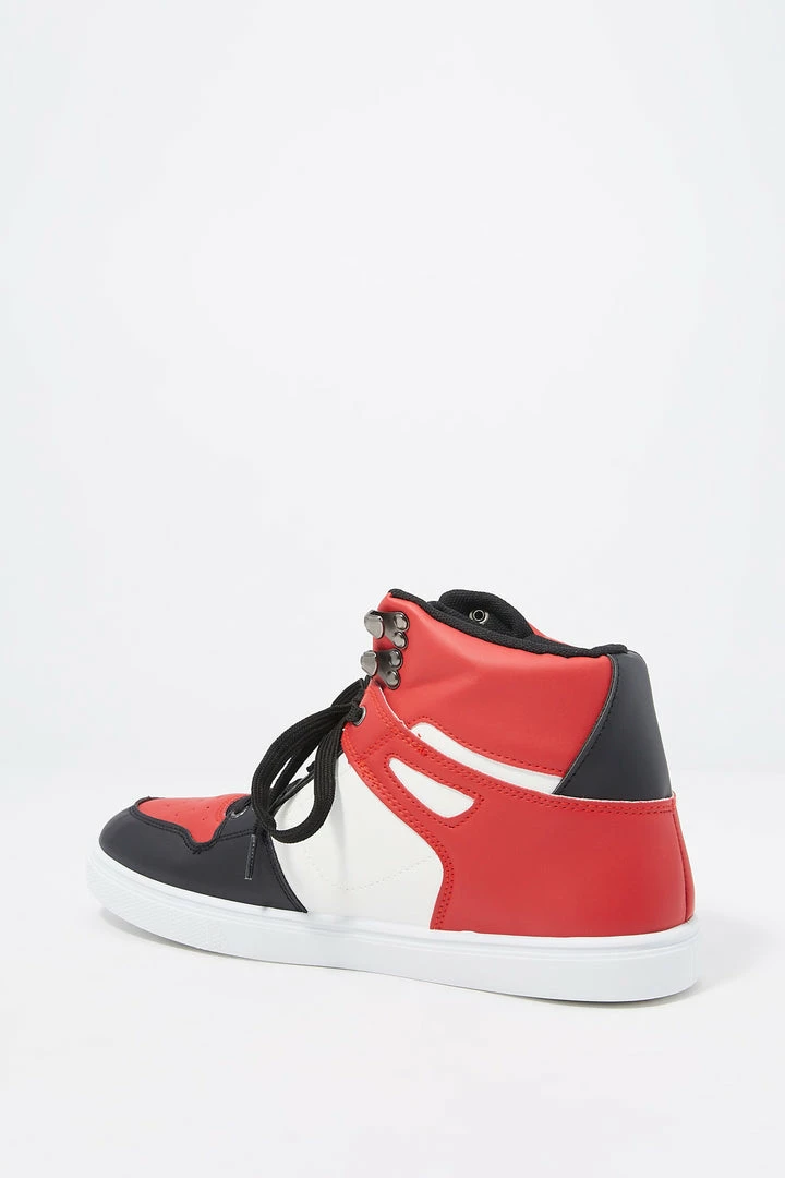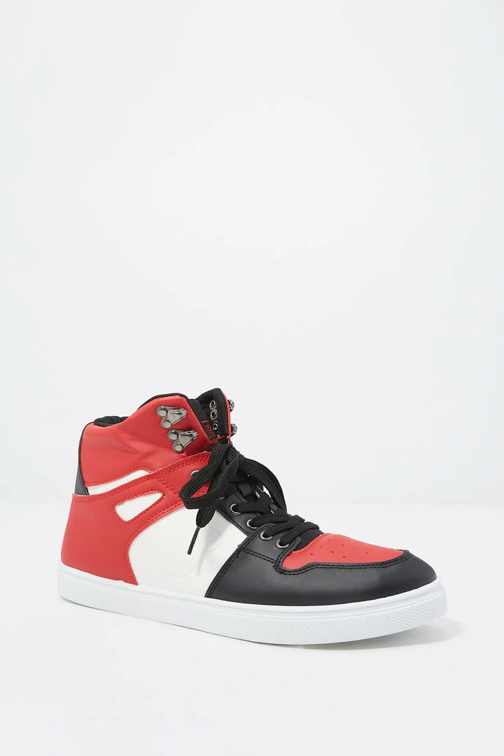 Keep your shoe standards high and your tops even higher! Reach for the sky in shoes that are super fly. This sneaker features colour block print, high top design, lace-up front, metal loop accents and comfort sole.