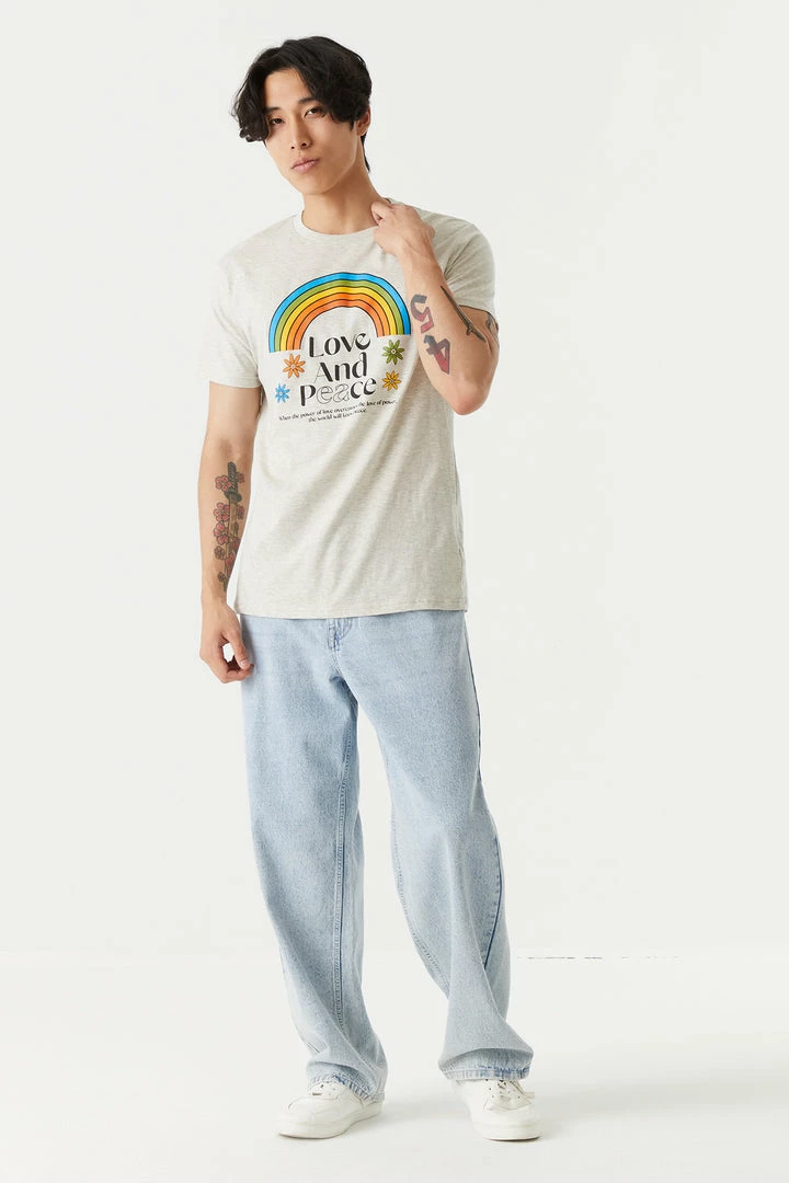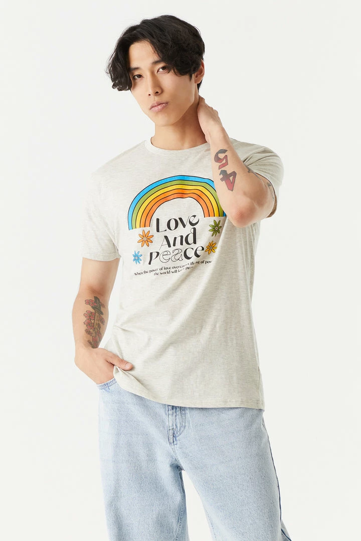 If you want a rainbow, you have to endure a little rain! This t-shirt features crew neckline, short sleeves and love and peace rainbow front graphic.