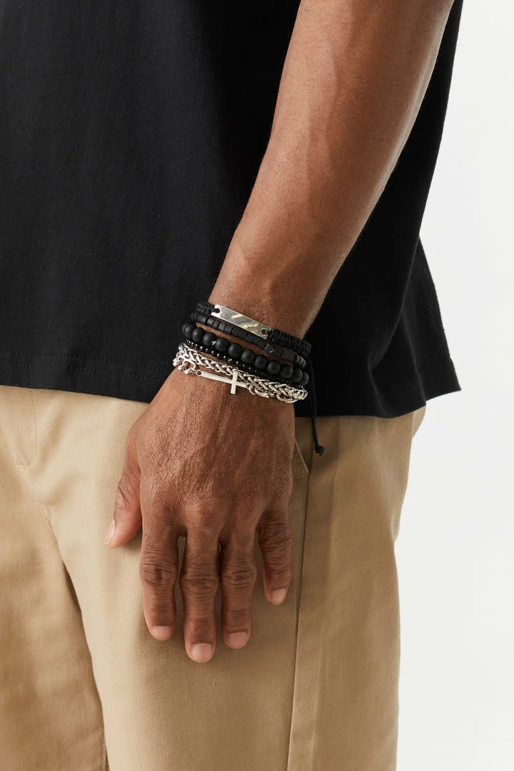 Take any outfit to the next level with this seasons must-have accessorie. This set features assorted woven faux-leather rope, small beaded bracelet, metal band bracelet and cross charm chain bracelet with lobster clasp and pull string closures.