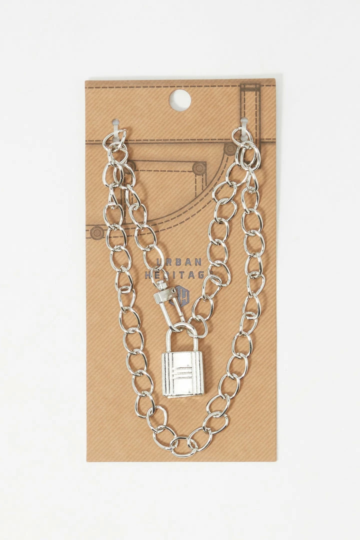 Need a quick outfit fix? Spice up your looks with this cool pant chain. This chain features a silver lock pendant and a double layer chain.