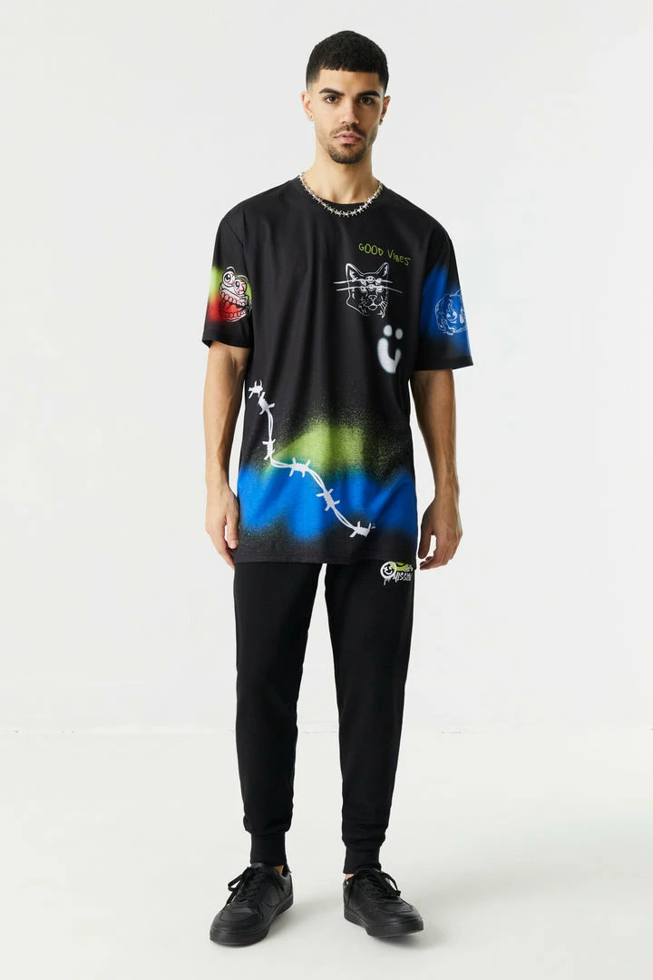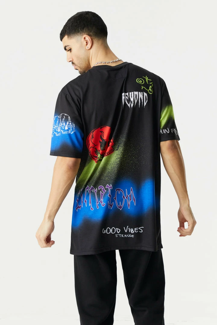 Make your doodle dreams come true with this striking shirt. This t-shirt features crew neckline, short sleeves and all over spray paint and doodle print.