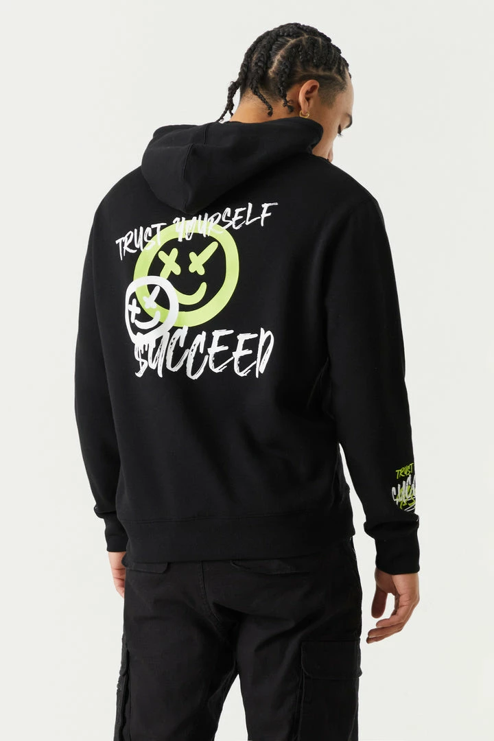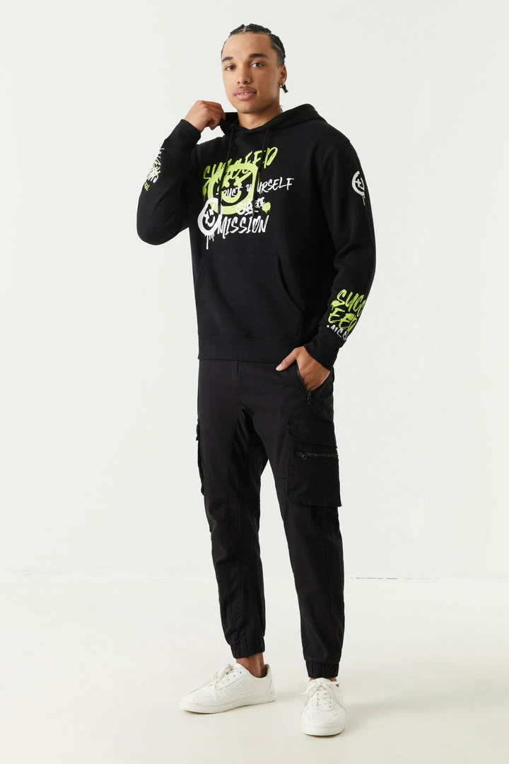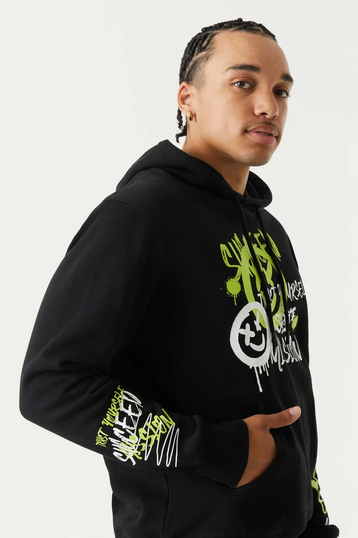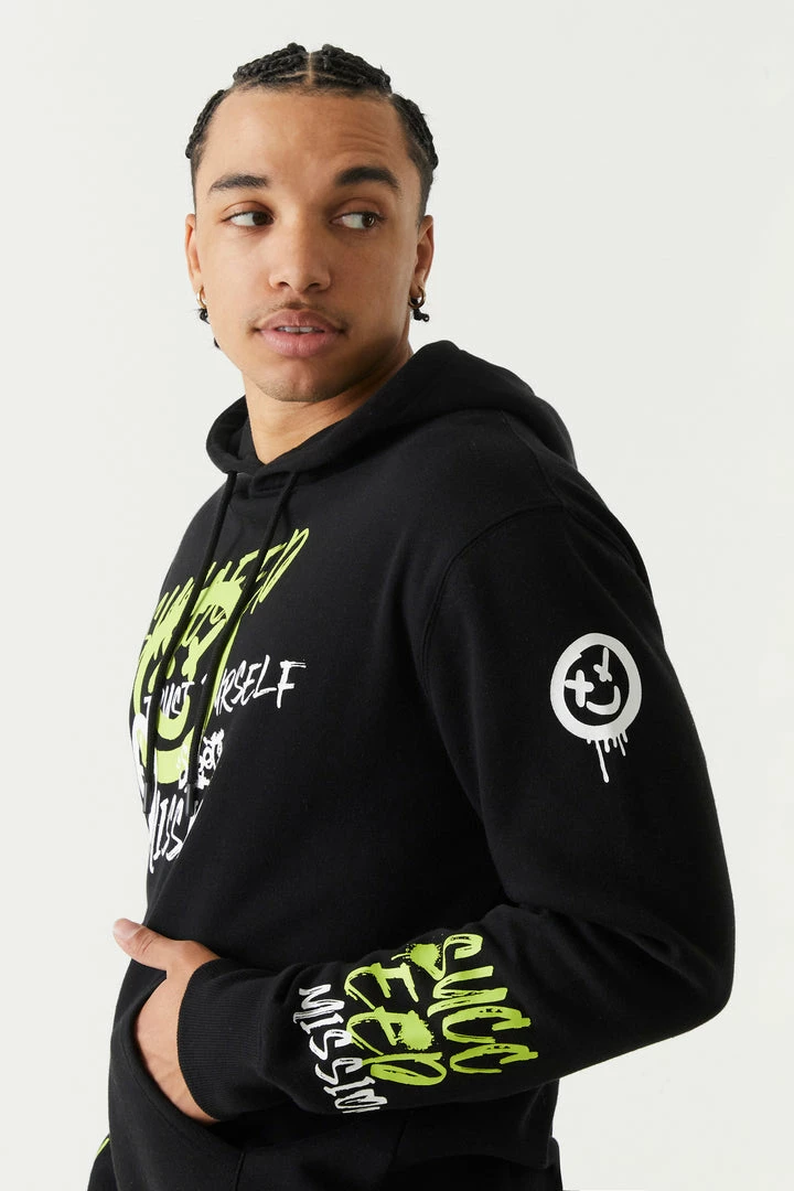 Leave your mark with street art inspired streetwear! This hoodie features spray paint smiley graphics, drawstring hood, kangaroo front pocket and ribbed knit cuff and hem.