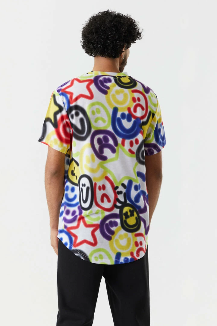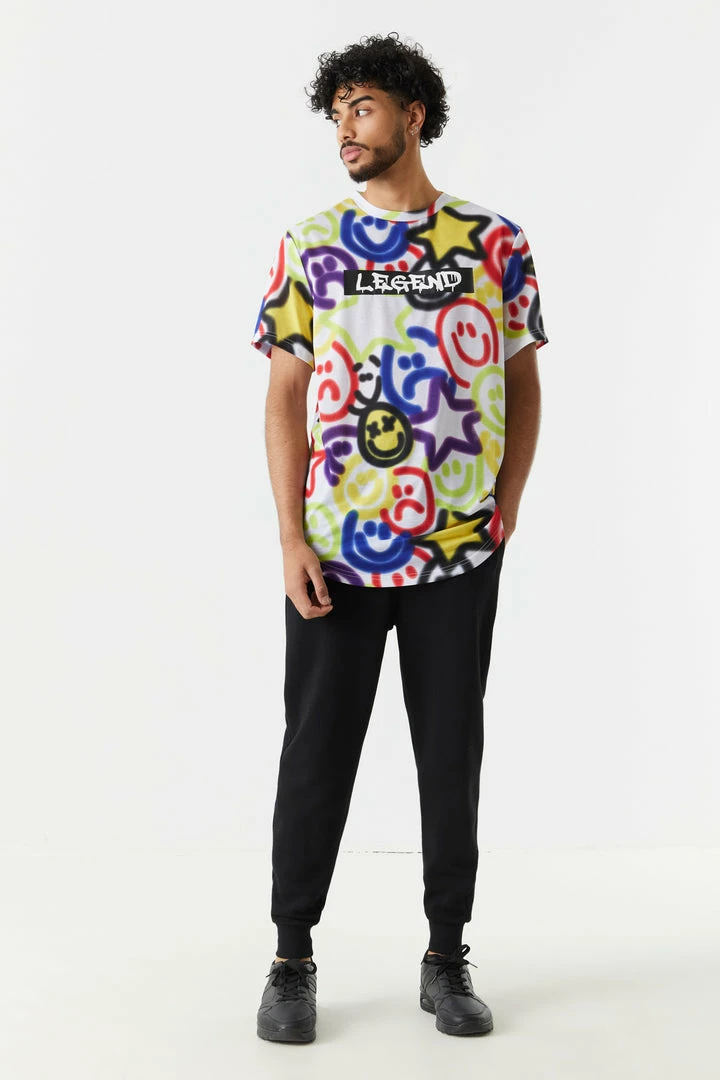 The street isn’t the only place that’s got stylish street art! Check out the bold print on this legendary tee. This t-shirt features crew neckline, short sleeves, all over spray paint smiley print and legend graphic.