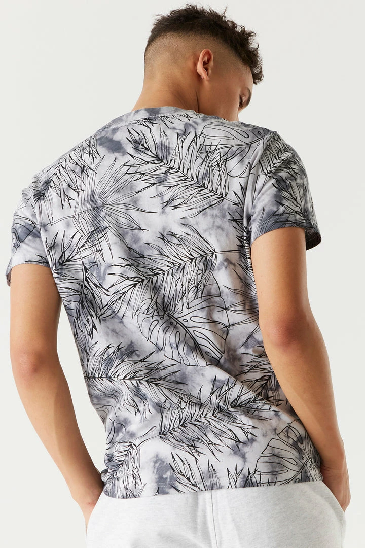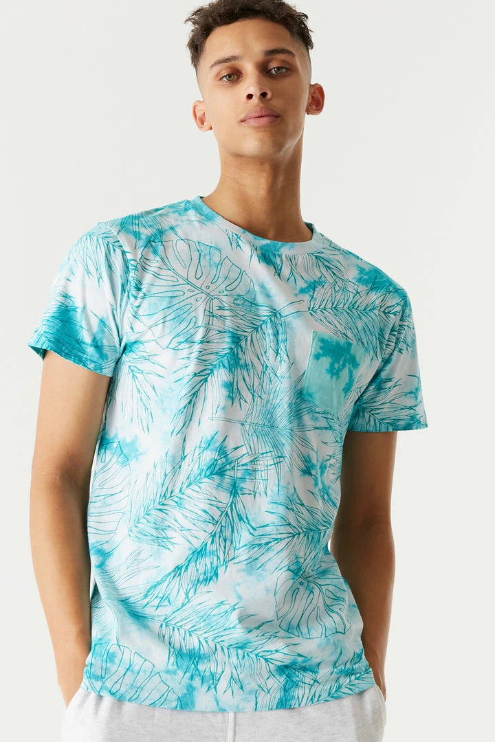 A tee that’ll feel like a step closer to summer. This tank features a crew neckline, front chest pocket, tie-dye print with tropical leaves graphic and short sleeves.
