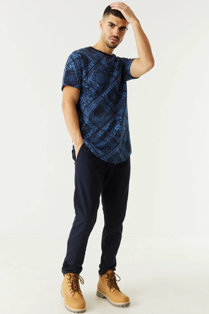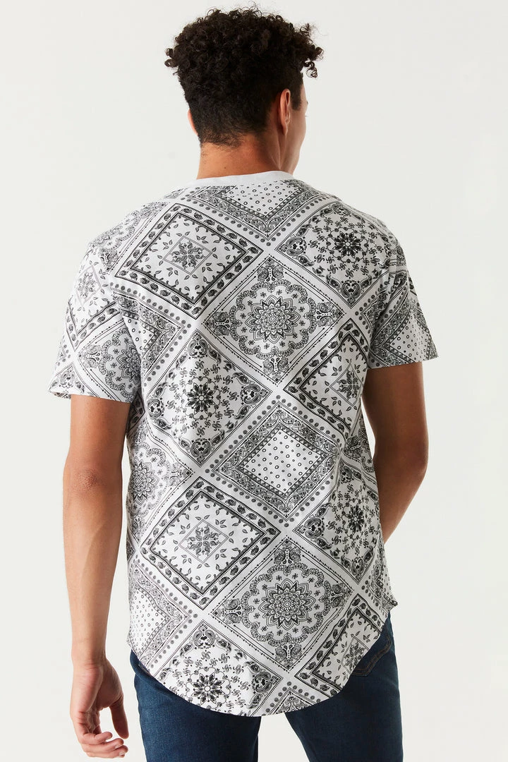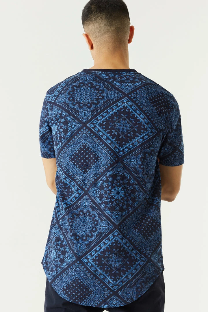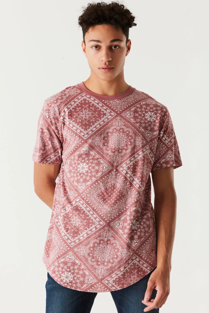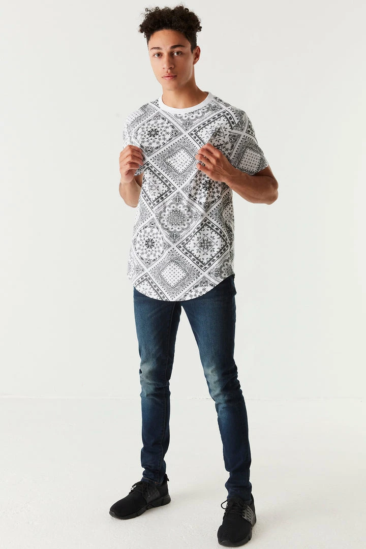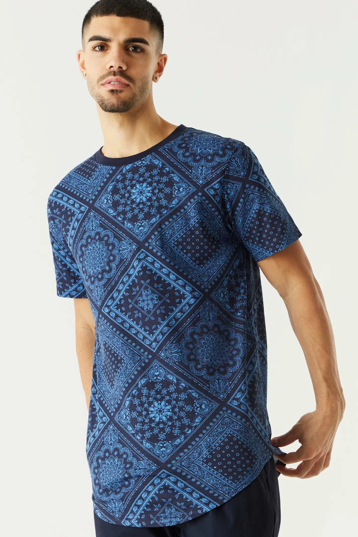 Add a bit of street heat in to your wardrobe with a bandana printed tee! This t-shirt features a crew neckline, all over bandana print, longline length with rounded hem and short sleeves.