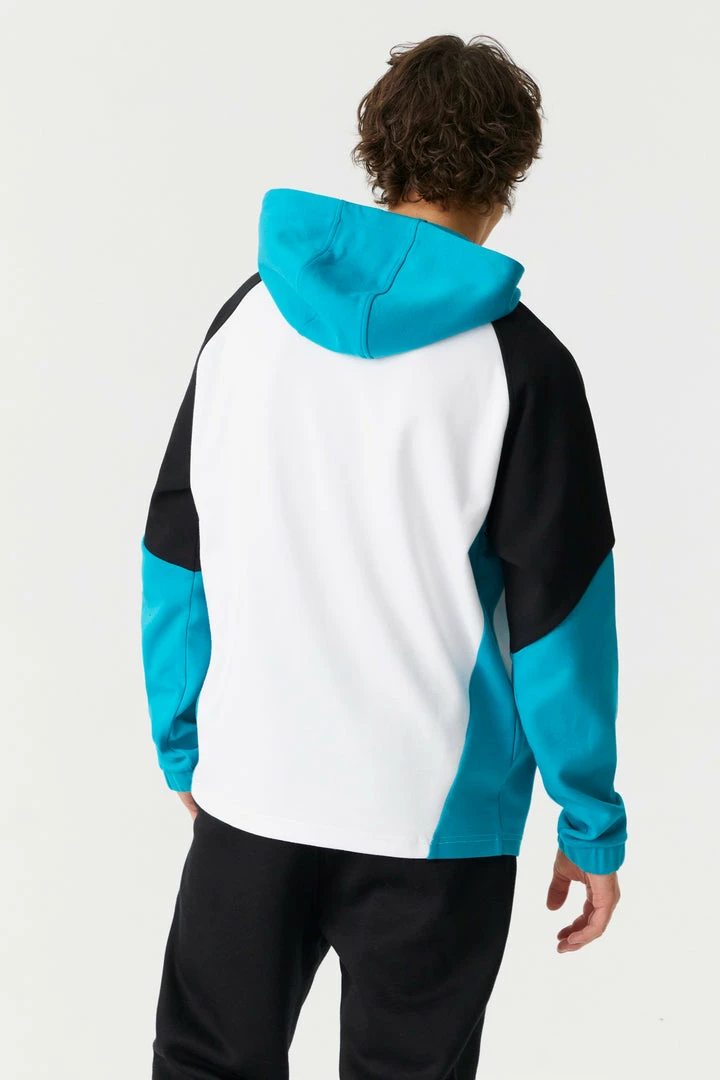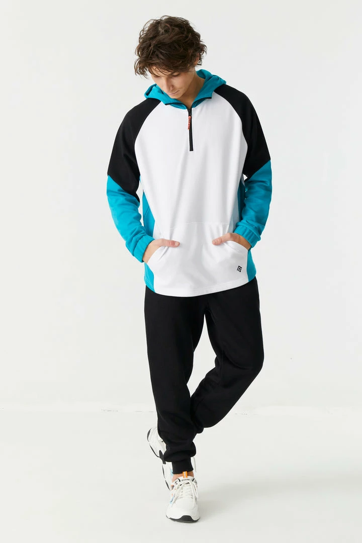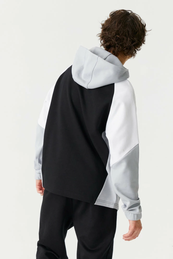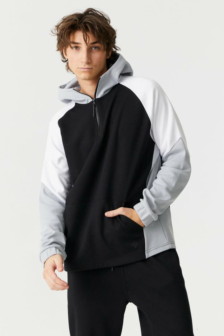 Warm up while keeping your cool factor in this stand out sweater. This hoodie features kangaroo front pocket, half zip neckline, hood, colour block sleeves and ribbed knit hem.