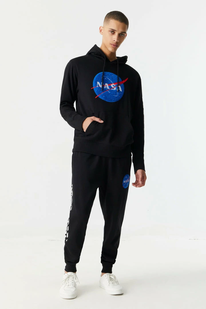 You do astro-not want to miss out on this space inspired sweater. This hoodie features NASA front and arm graphics, drawstring hoodie, ribbed knit cuffs, chenille material and ribbed knit hem. Complete the set with the NASA Graphic Chenille Jogger.