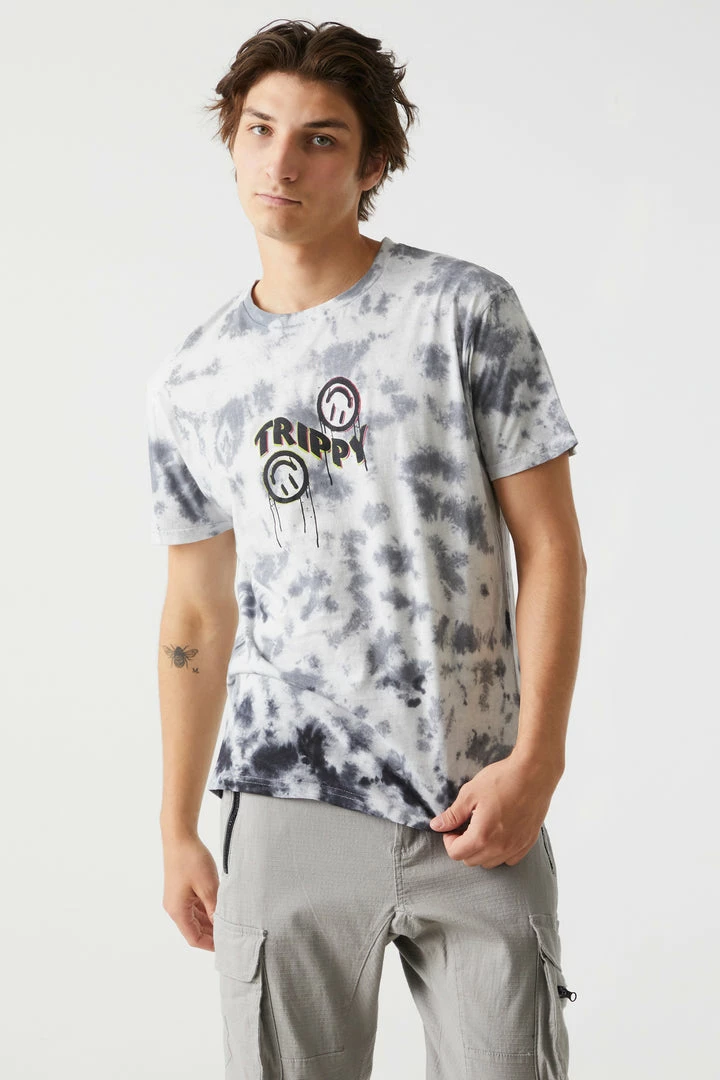 Stop trippin’ and smile! Take it easy in this relaxation station tee. This t-shirt features crew neckline, short sleeves, tie-dye print and trippy smiley graphics.