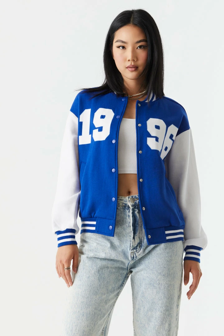 Embrace your inner main character and make a statement in this iconic varsity fit. This jacket features contrast cuffs and hem, button-up front, colour block sleeves, two pockets and 1996 varsity front graphic. Size Runs Small.