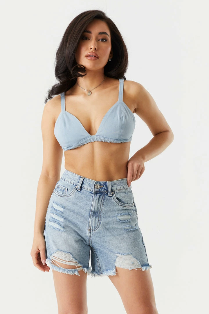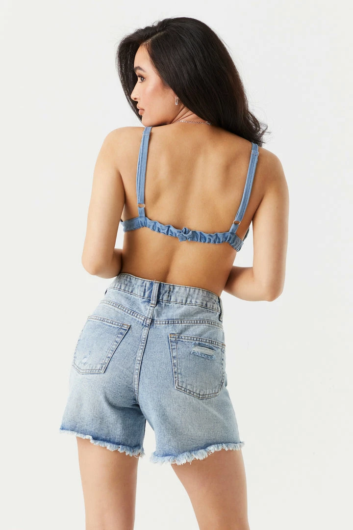 A bralette this jean-y is giving us serious Y2K flashbacks and we are living for it! This top features deep v-neckline, denim material, ruched band, adjustable straps and back clasp. Size Runs Small.