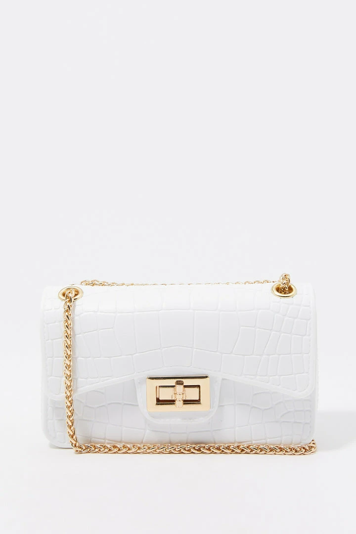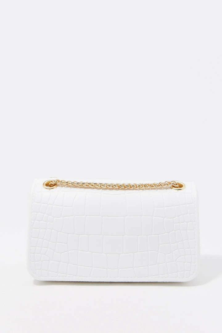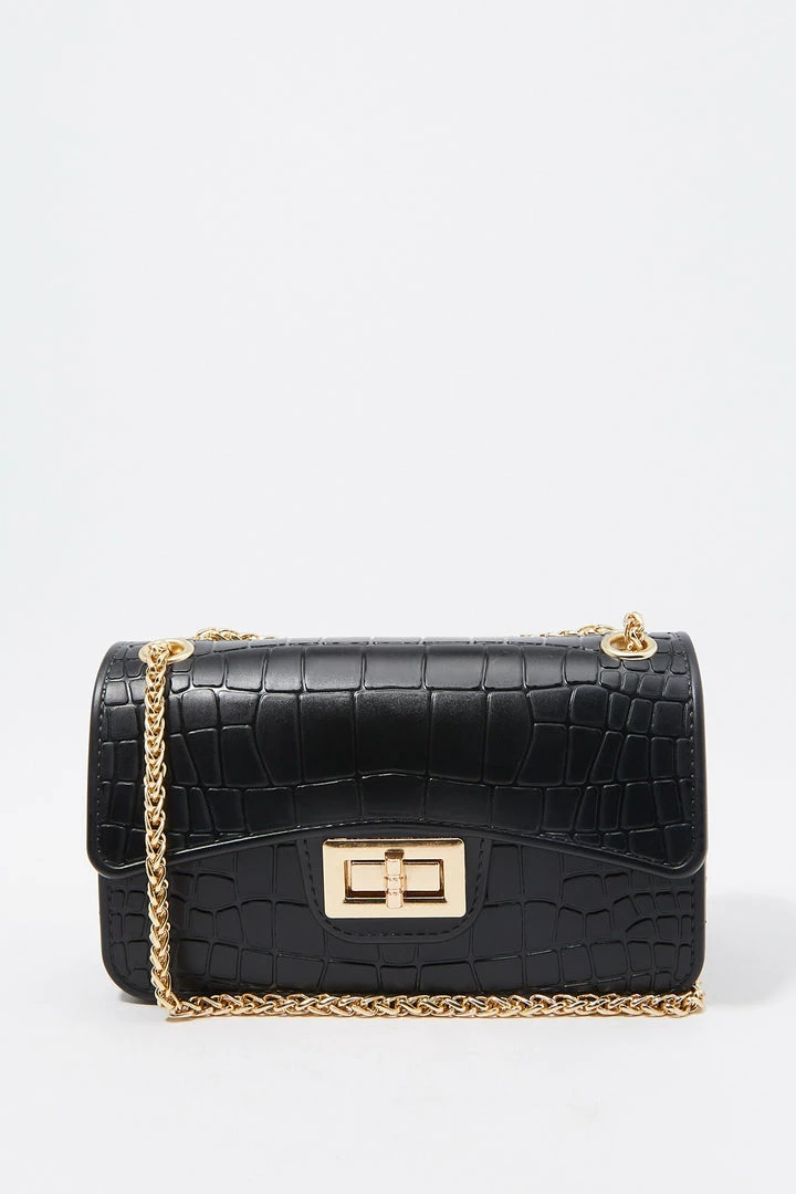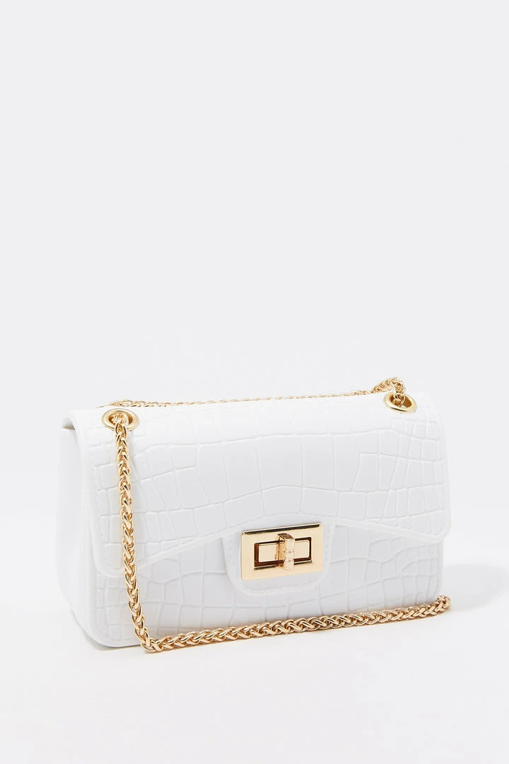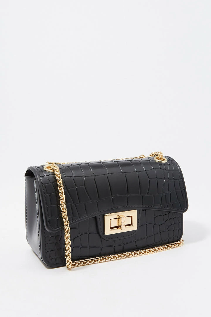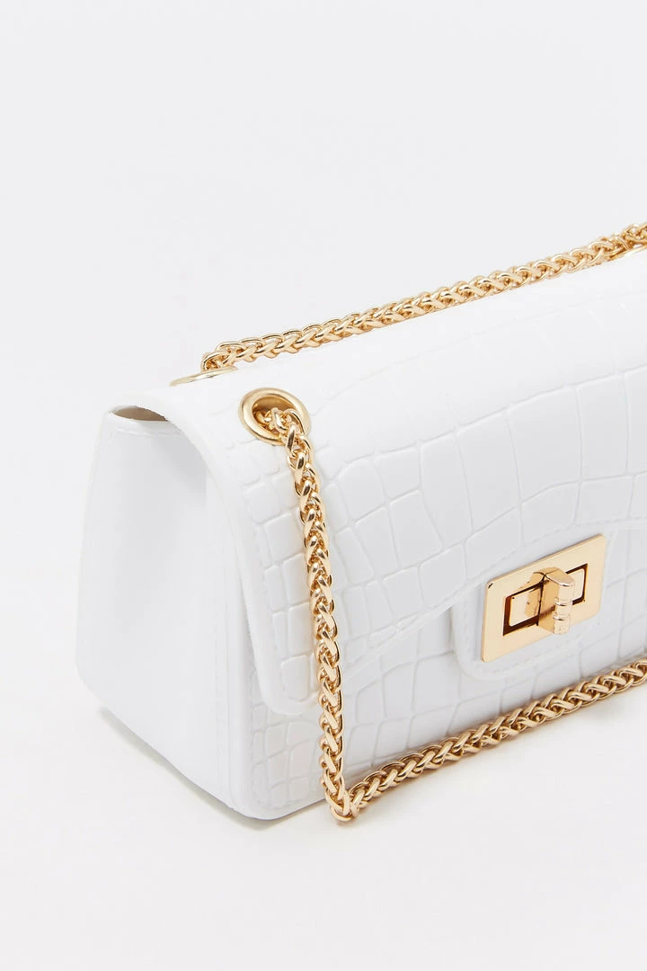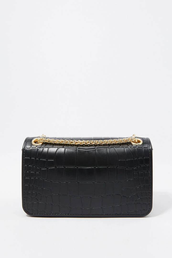 Rock the croc! Bag this beauty and take any outfit from bleh to bombshell. This bag features single clasp closure, embossed croc material and small chain link shoulder strap.