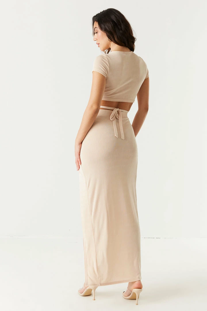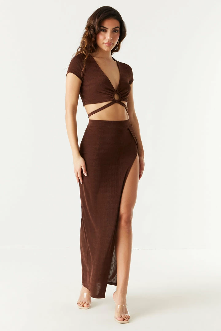 Show some skin in this sleek fit maxi! This skirt features maxi fit and thigh high leg slit. Complete the look with the Crisscross Self-Tie O-Ring Cropped Top. Size Runs Small.