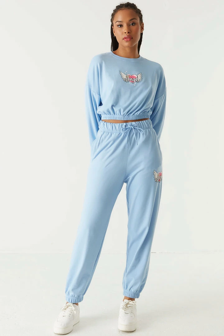 Remember when joggers were reserved for weekends on the sofa? These comfy ones are meant for more than chilling in! From working out to working from home, they’ll keep you satisfied from Monday to Sunday. This jogger features an elasticized waistband with drawstrings, two pockets, soft fleece material, leg graphics and cinched bottoms. Size Runs Small. Complete the ‘fit with Soft Fleece Cinched Hem Angel Graphic Long Sleeve Top