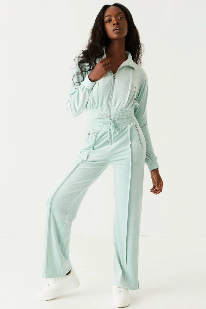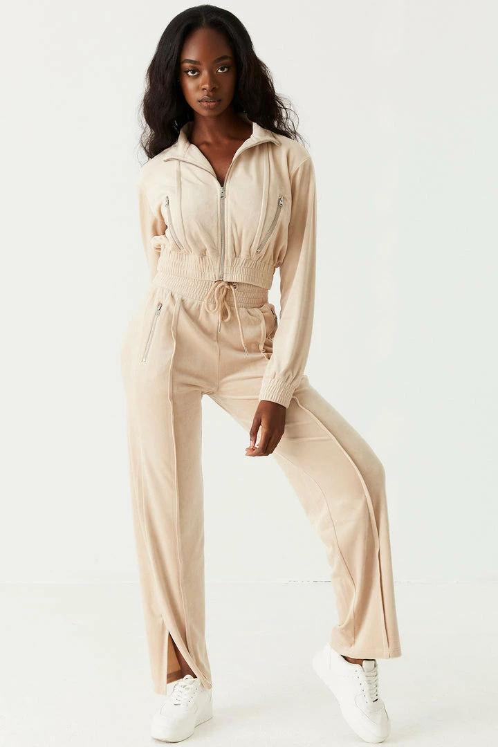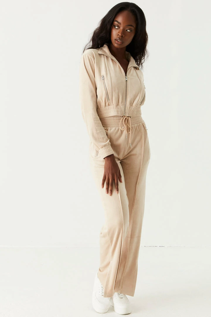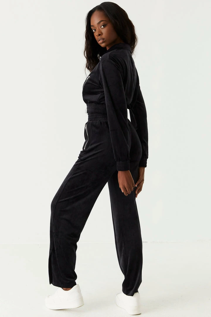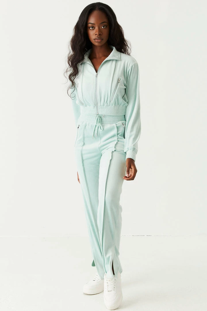 Soft to the touch and easy on the eyes this velour jogger is your new go-to. This jogger features an elasticized waistband with drawstrings, front seam detail with slit details at the bottom, velour material and two zip pockets. Size Runs Small. Set me up with Velour Mock Neck Zip-Up Cropped Sweater
