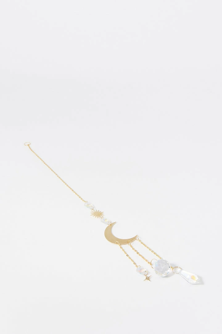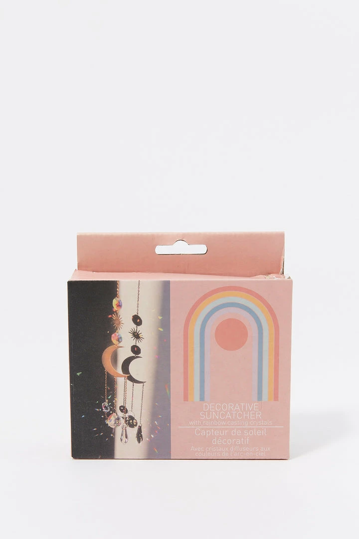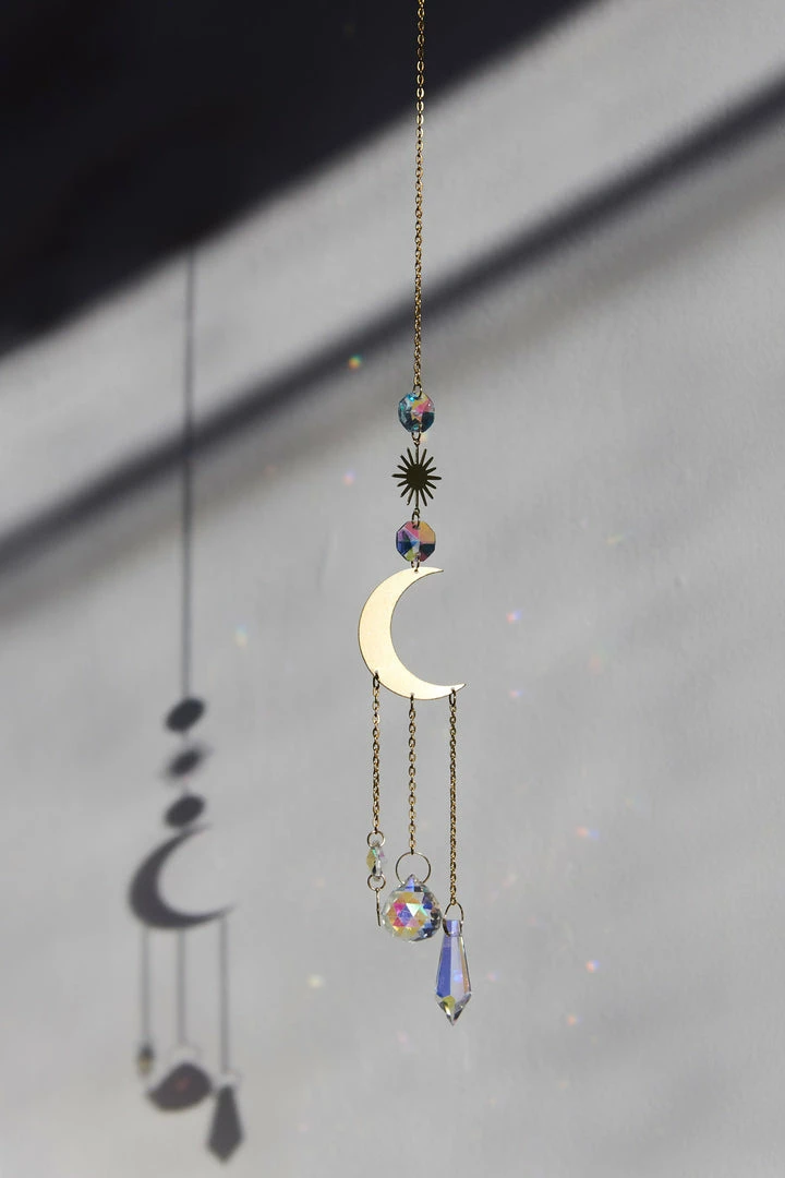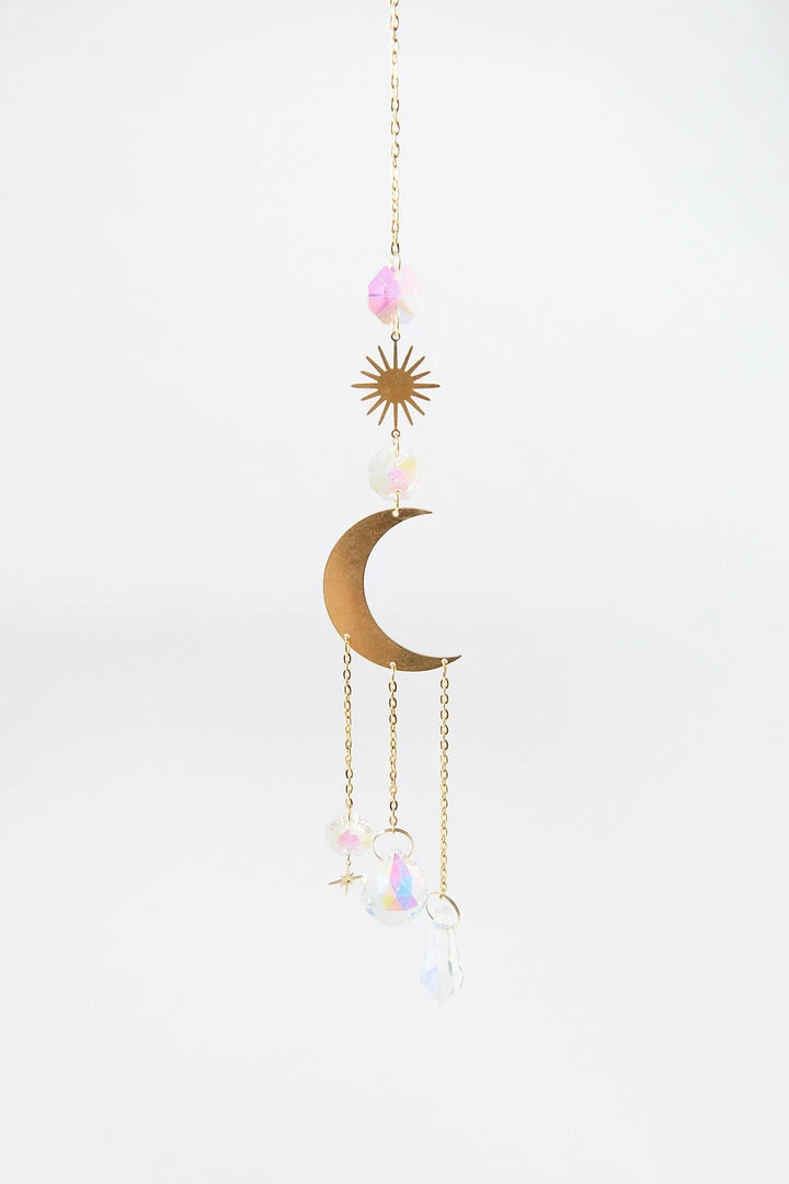You deserve the sun and the moon! Bring the awe-inspiring beauty of outer space into your home with this stunning suncatcher. This suncatcher features crystal prisms and brass detailing.
