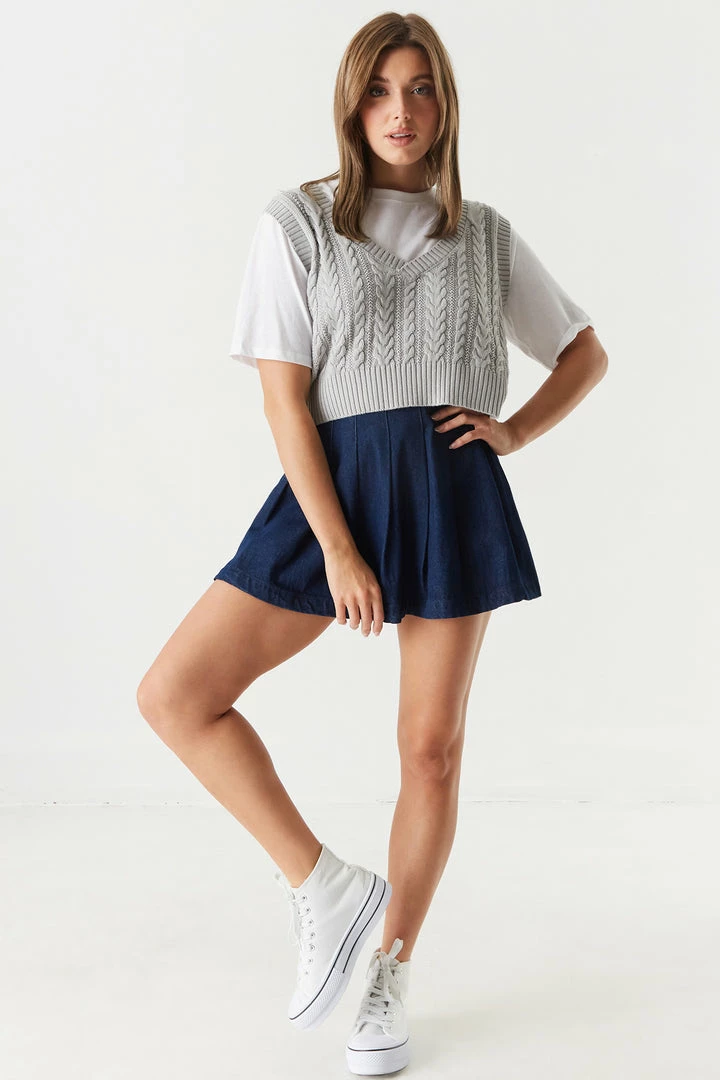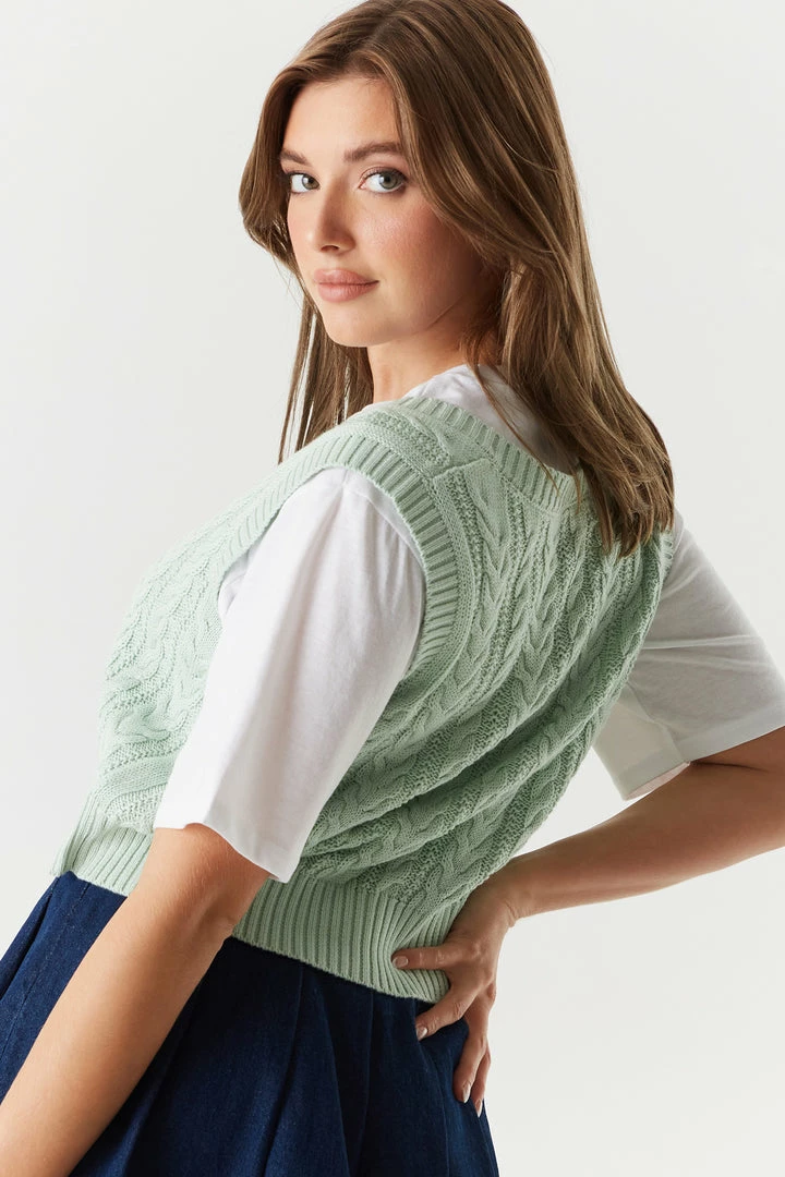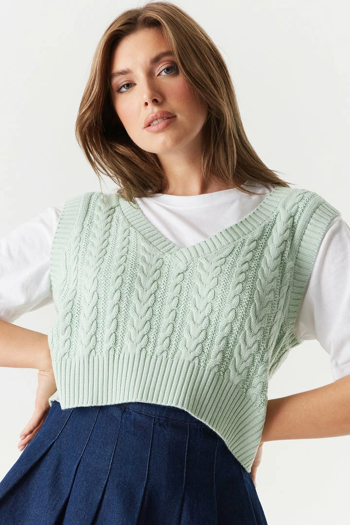 Your new “vest” kept secret during the cooler months! Perfect for layering, this vest is designed to easily slip over most any long-sleeved shirt. This sweater vest features a v-neckline, cable knit material, sleeveless arms and cropped length. Size Runs Small.