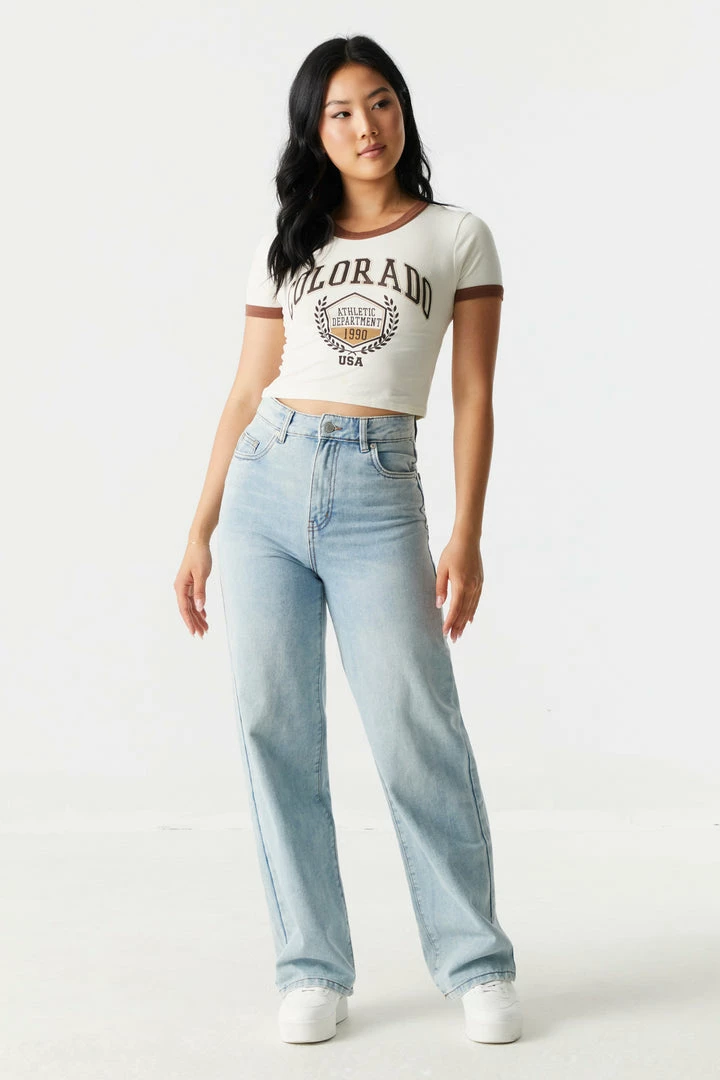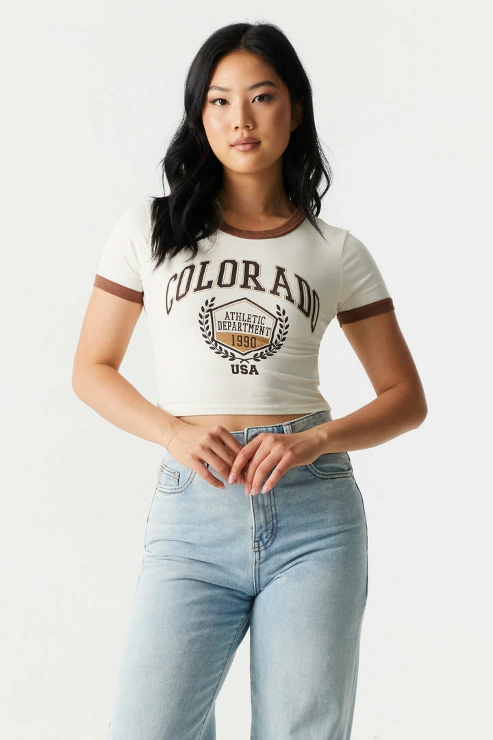 Explore the big world in a tiny top! From the highway to the hike this roadtrip tee will make you the only sight worth seeing. This t-shirt features short sleeves, cropped fit, contrast trim, crew neckline and Colorado front graphic. Size runs small.