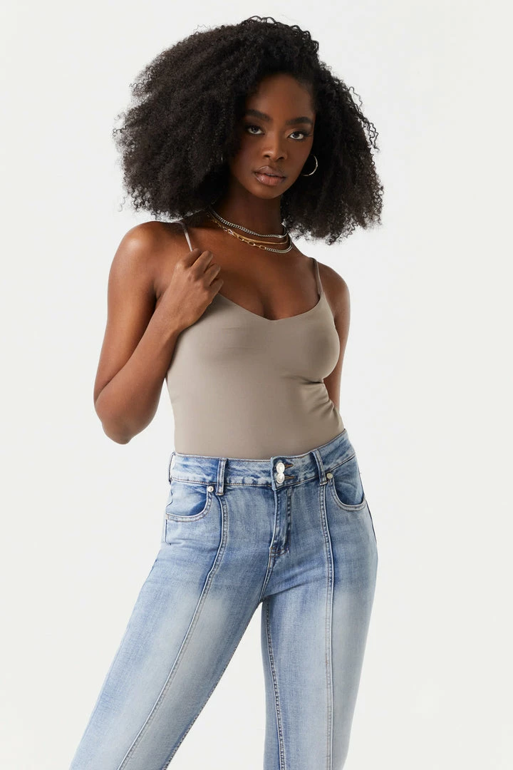 Keep it all tucked in with this fitted dream of a bodysuit. This bodysuit features adjustable spaghetti straps, v-neckline, clasp closure bottom and contour fit. Size runs small.