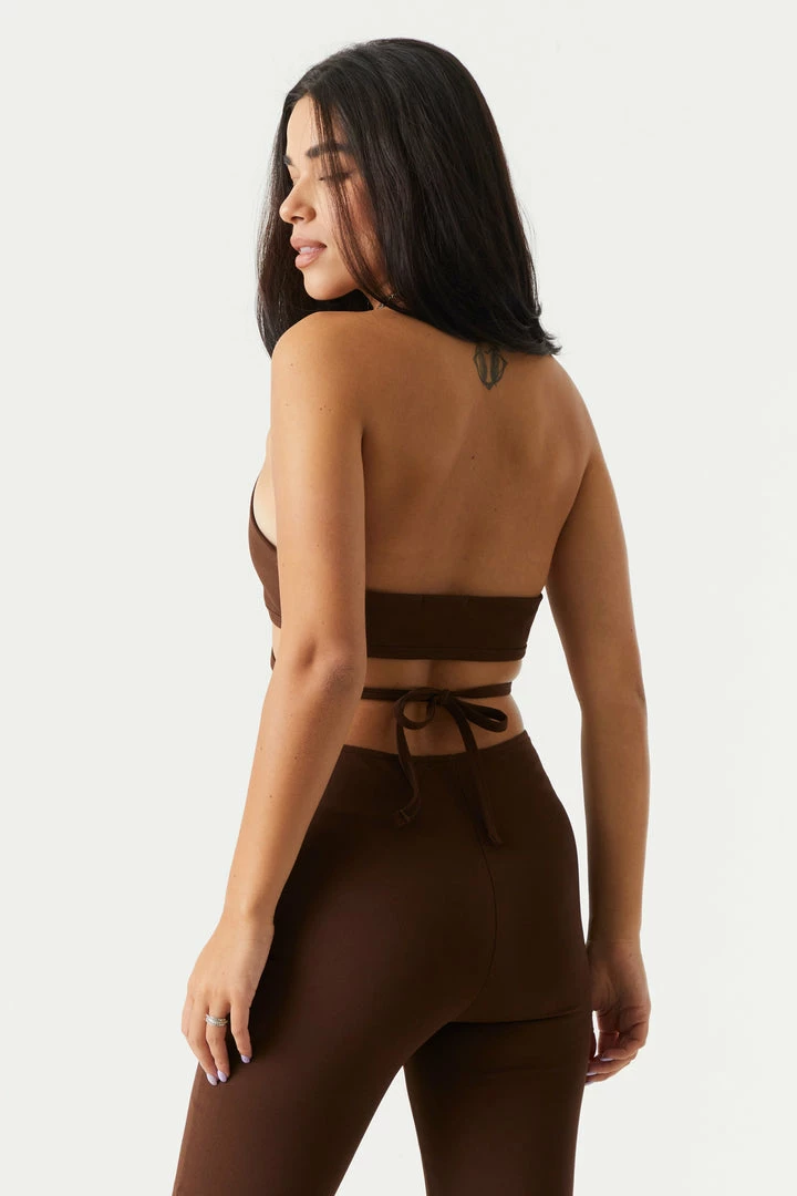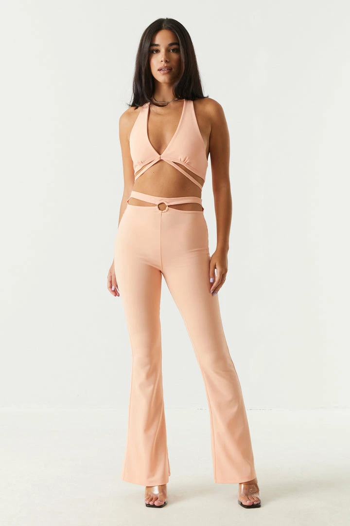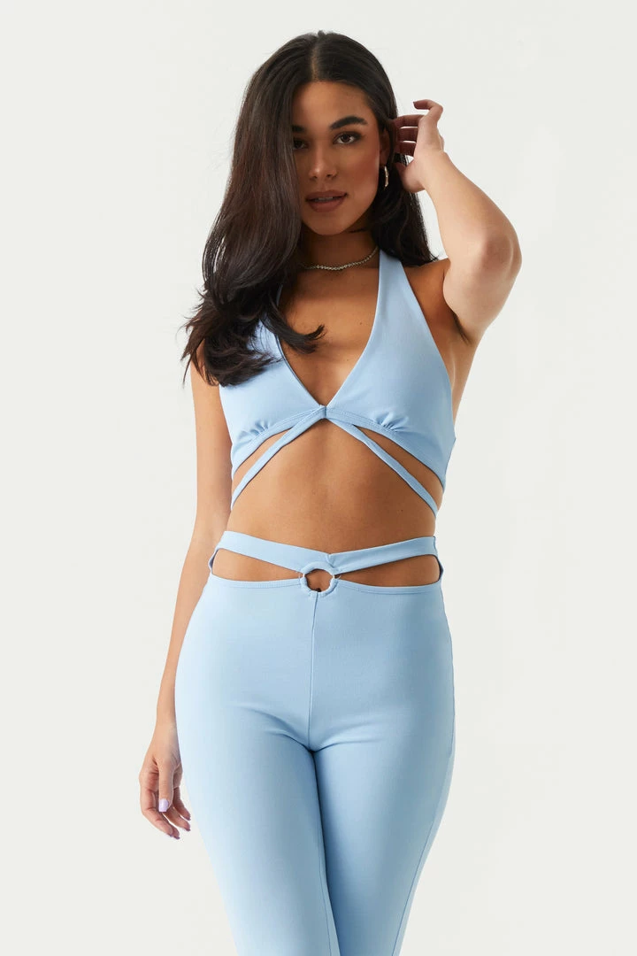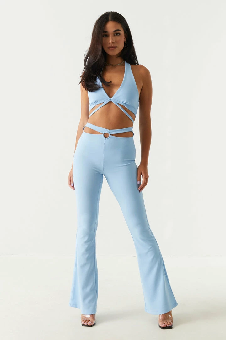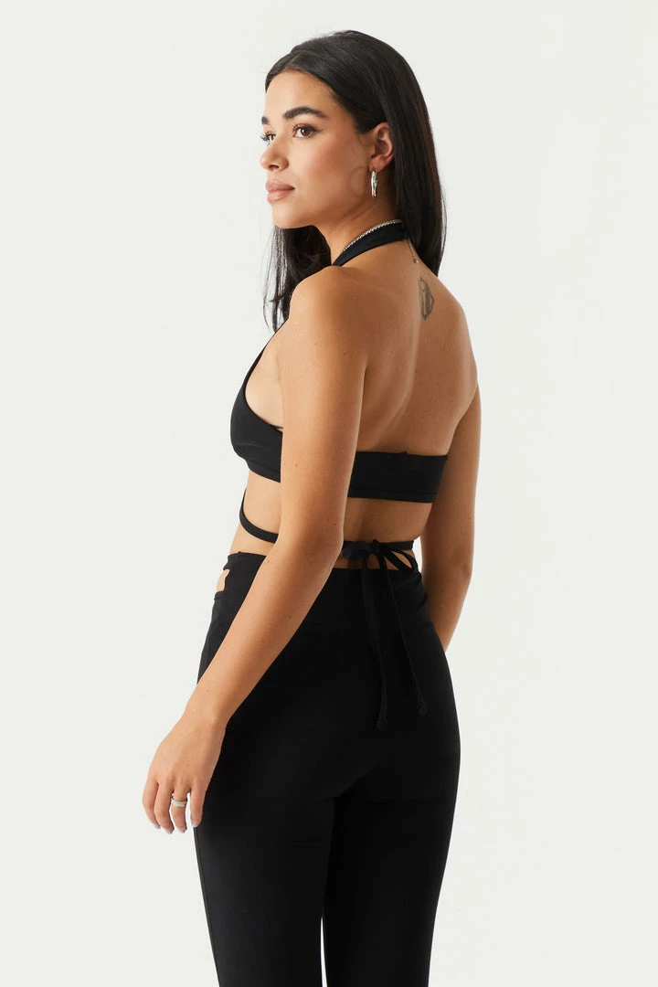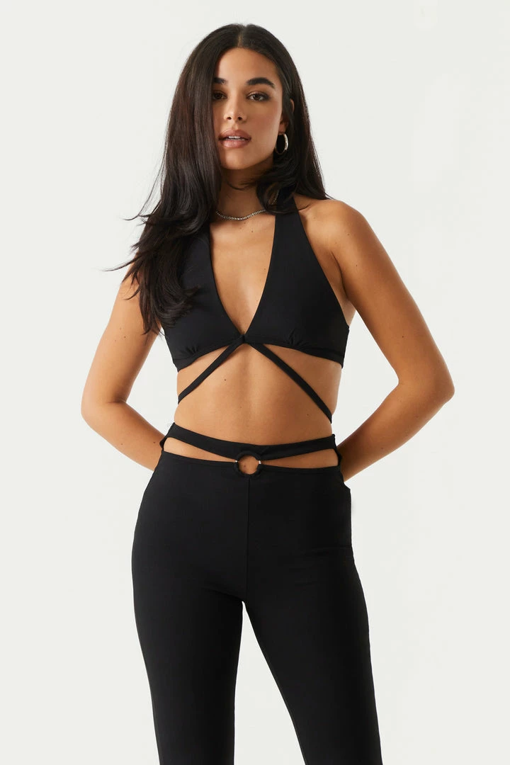Get ready for an epic night out in this stunning set! As a stand alone this top stands out, but paired with the matching bottoms your look will be next level. This top features strappy details, self-tie back, halter neck, deep v-neckline and cropped fit. Size Runs Small. Complete the fit with the Crepe Knit O-Ring Flare Pant.