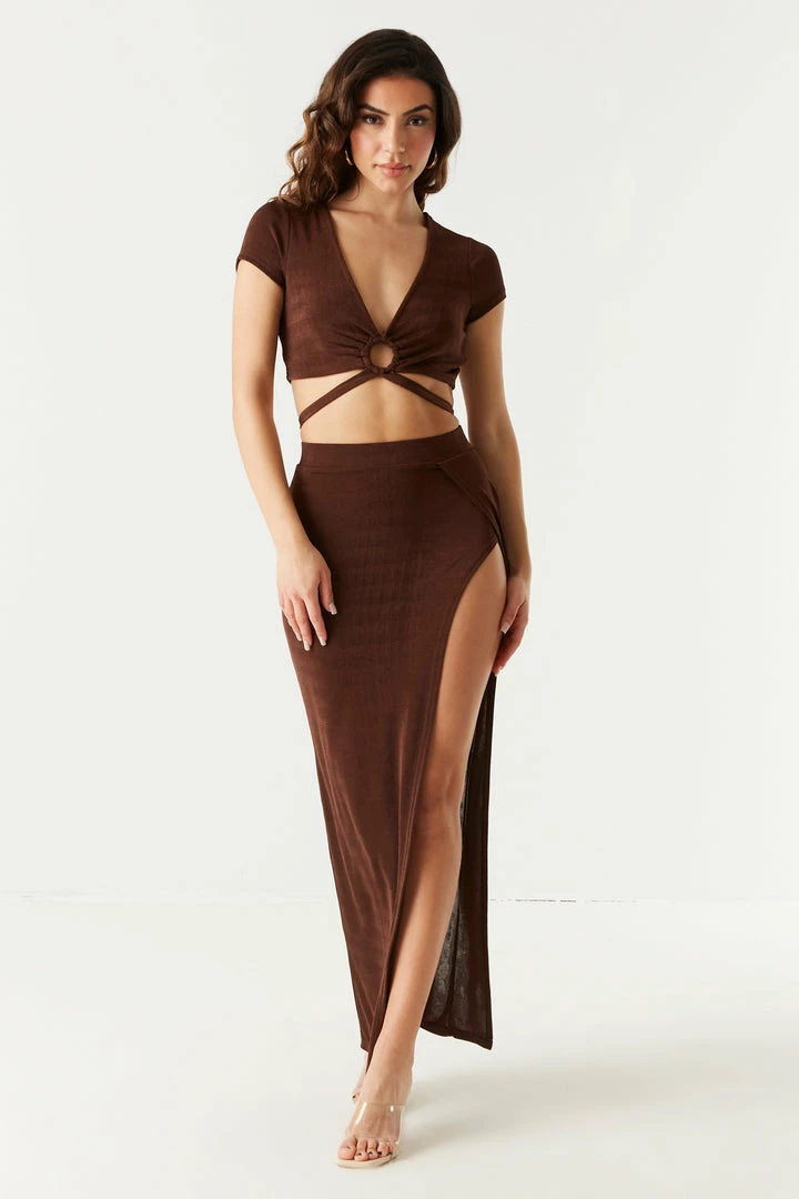 Cross trendy cropped tops off your summer-must have list! We have got you covered. This top features o-ring detailing, cross front self-tie waist and v-neckline. Size Runs Small. Complete the look with the Asymmetrical Leg Slit Maxi Skirt.Â
