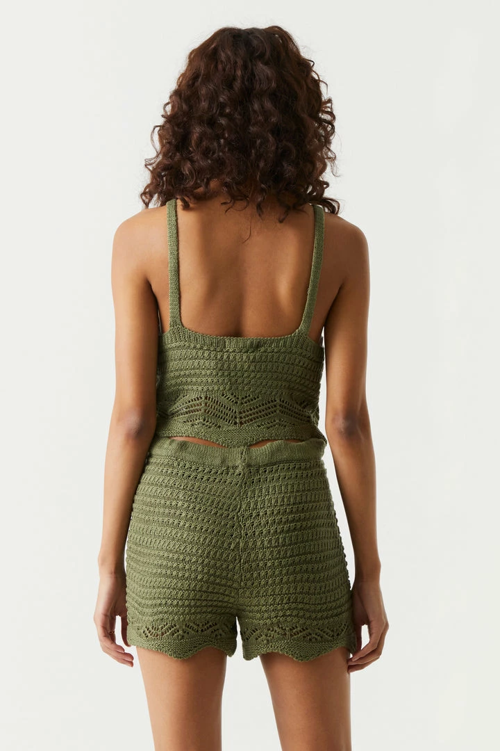 This is knit your average cropped top! There’s no mistaking this fun fit for your grandma’s crochet. This cami features button-up front, scoop neckline, crochet knit and cropped fit. Size Runs Small. Finish the fit with the High-Rise Crochet Short.