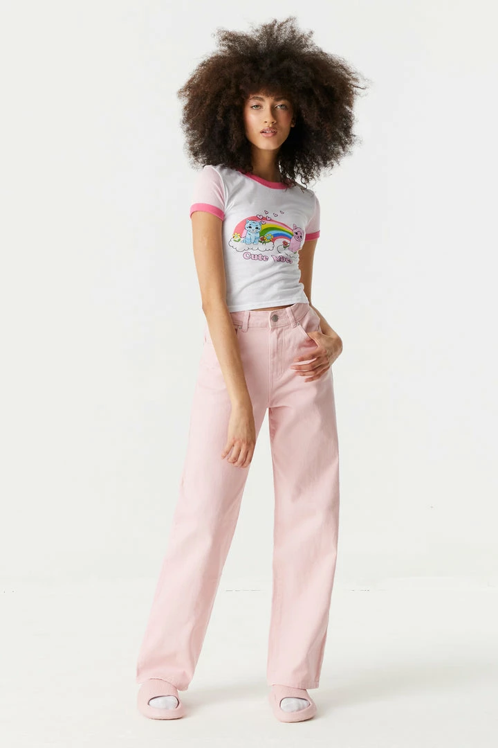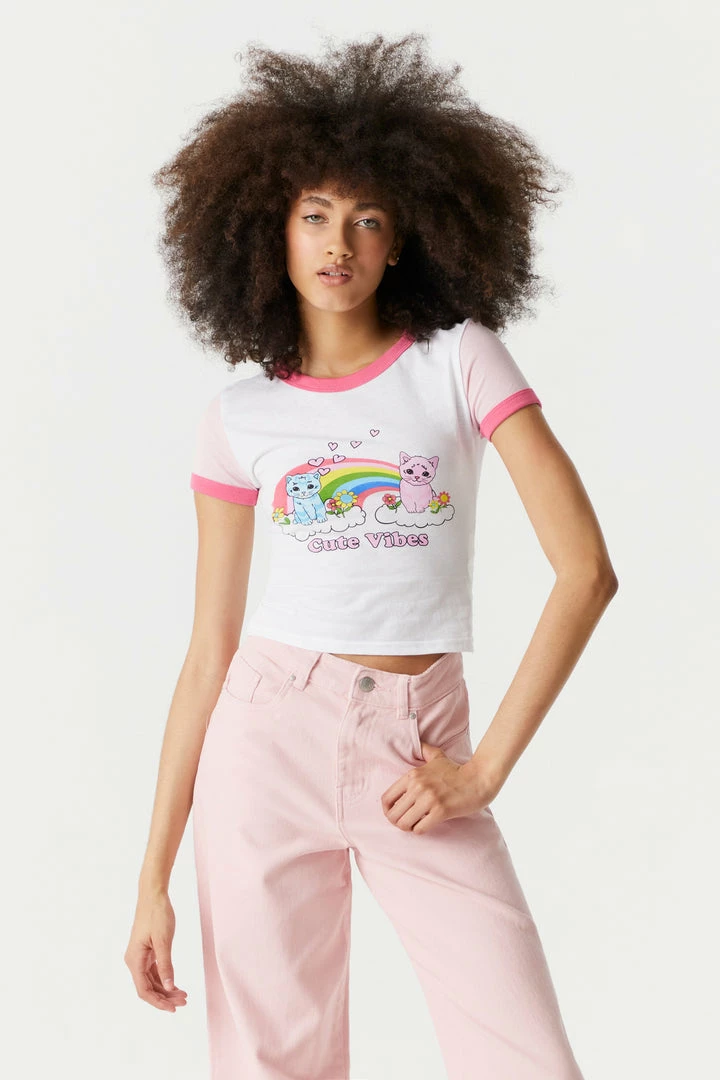 No matter the weather, crop tops are always a go! Stock up on some fun and cute styles. This t-shirt features a crew neckline, front graphic, short sleeves and a cropped length. Size Runs Small.