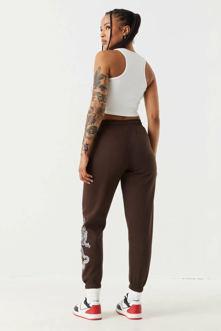 Jog through your day knowing that your pants are as cute as they are comfy! This jogger feature drawstring waist, two pockets, dragon leg graphic, cinched ankles, everyday fit and fleece material. Size Runs Small.