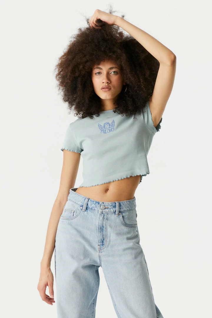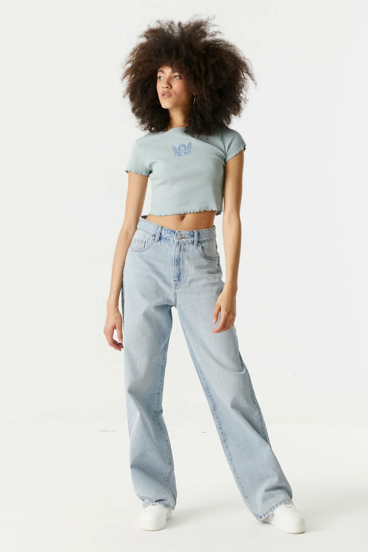 Stitches Ladies Embroidered Angel Graphic Lettuce Hem Cropped T-Shirt Tops