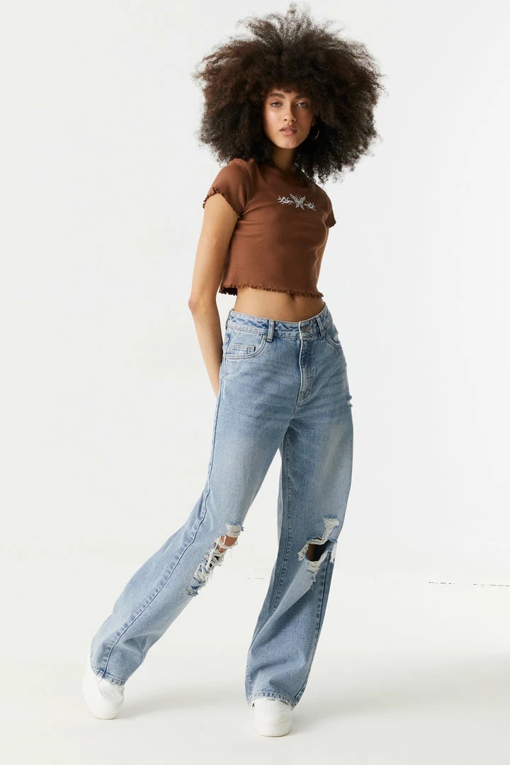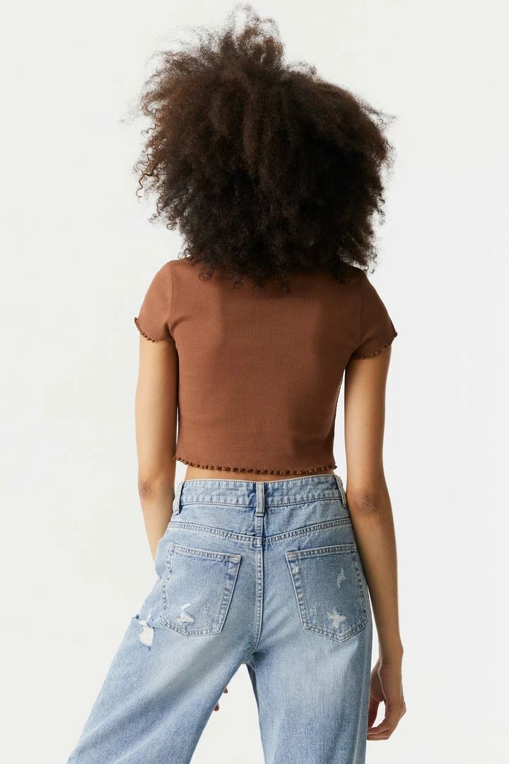 Make sure you get your daily dose of veggies with this lettuce hem tee! An essential part of any balanced outfit. This t-shirt features cropped fit, embroidered front graphic, short sleeves, crew neck and lettuce hem. Size runs small.