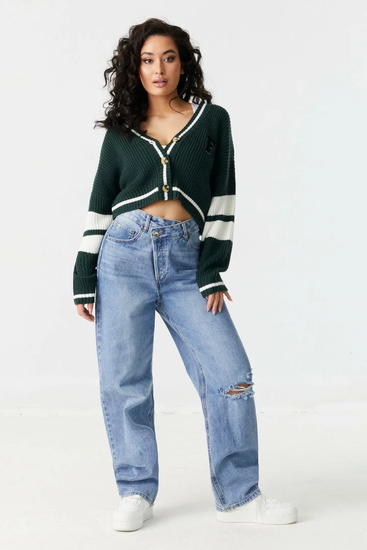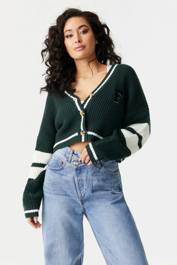 You’ll be too cool for school in this top of the class cardi. This top features three button-up front, cropped fit, v-neckline, F graphic, varsity detailing and contrast stipe hem. Size runs small.