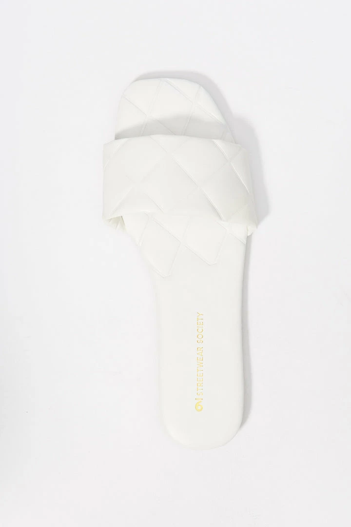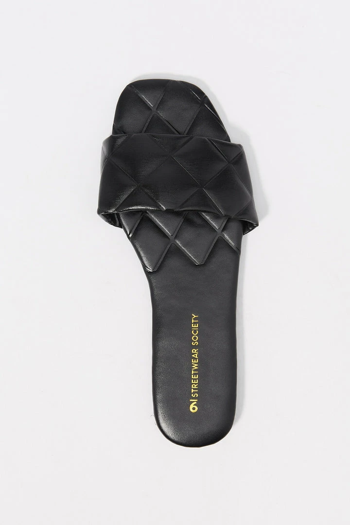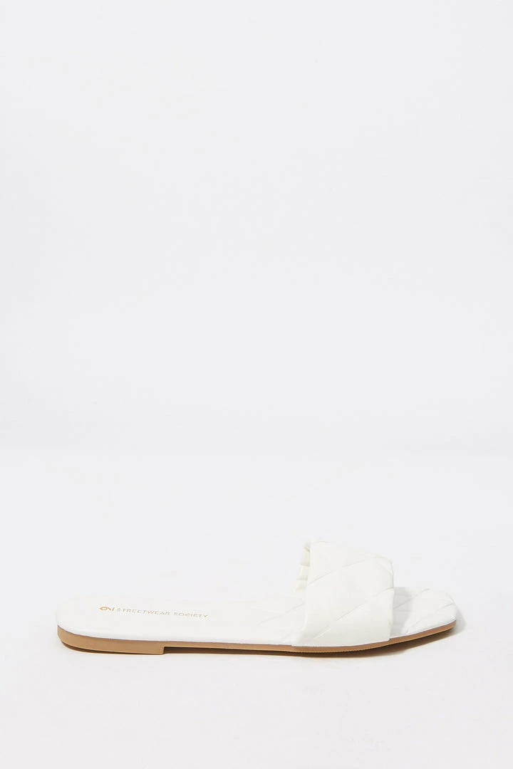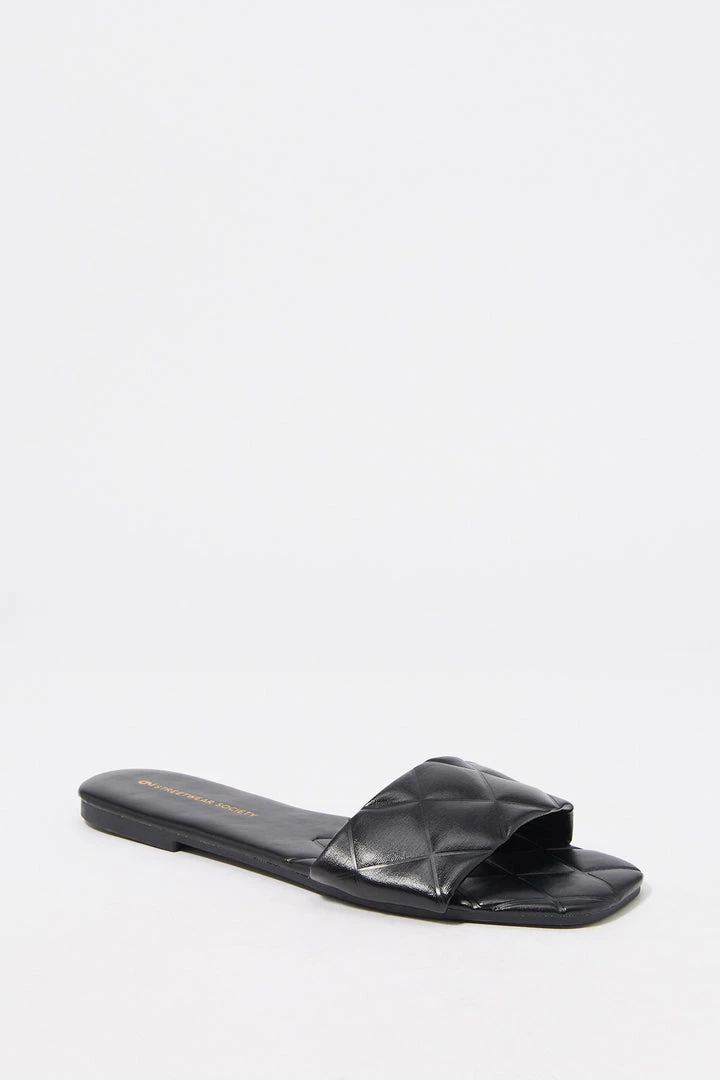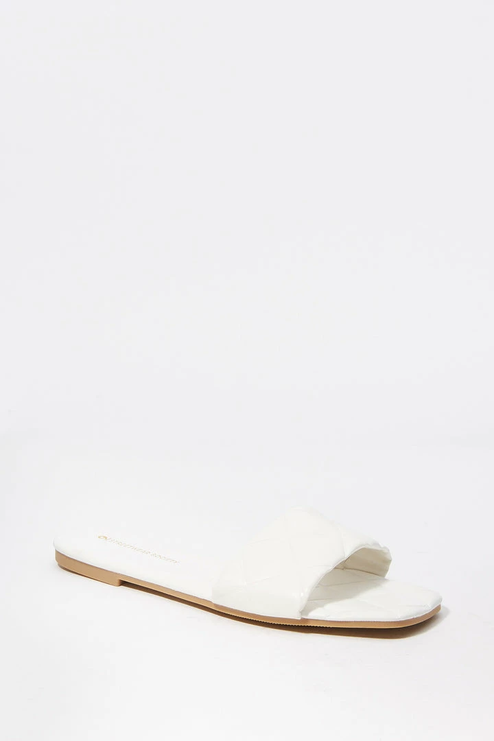 Sun’s out toes out! These go-to summer slide-on’s just won’t quilt. This shoe features easy slide on fit, large quilted band, embossed sole, faux-leather material and square toe.Â