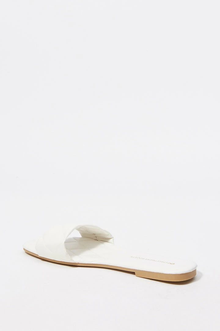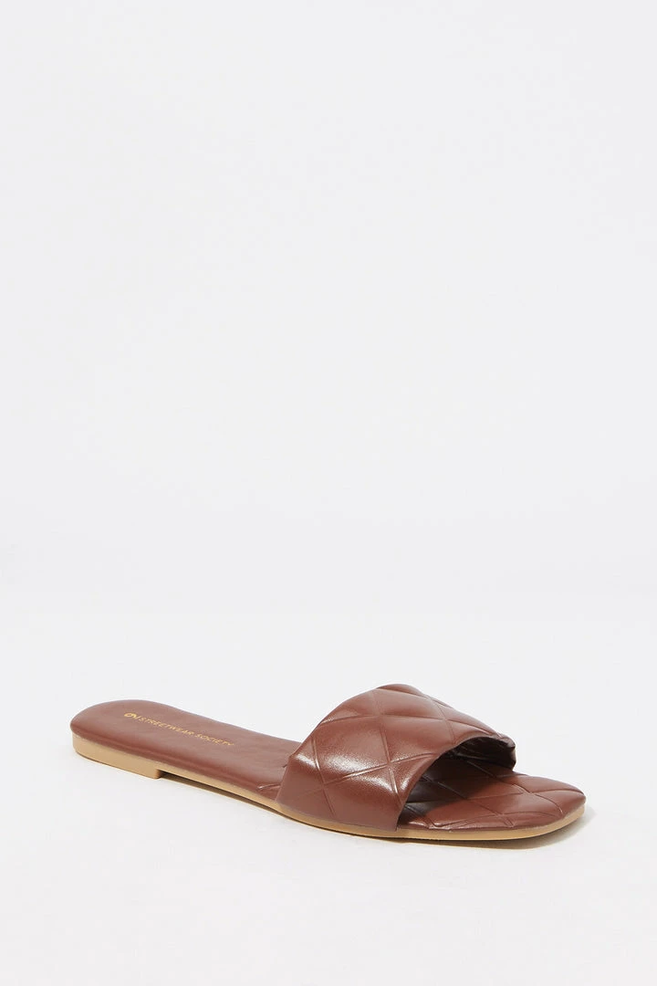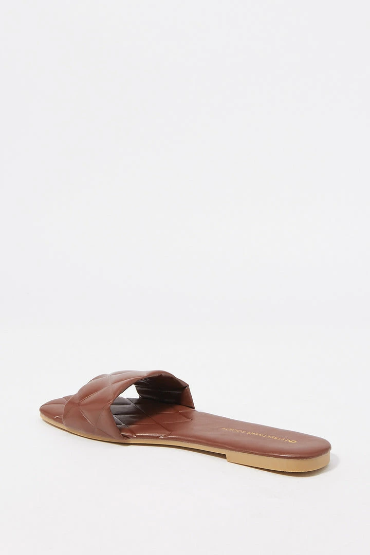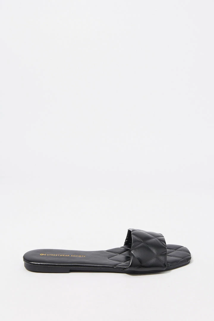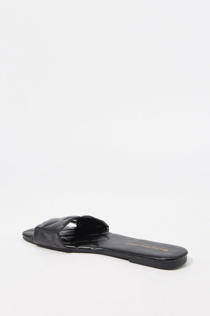 Sun’s out toes out! These go-to summer slide-on’s just won’t quilt. This shoe features easy slide on fit, large quilted band, embossed sole, faux-leather material and square toe.Â
