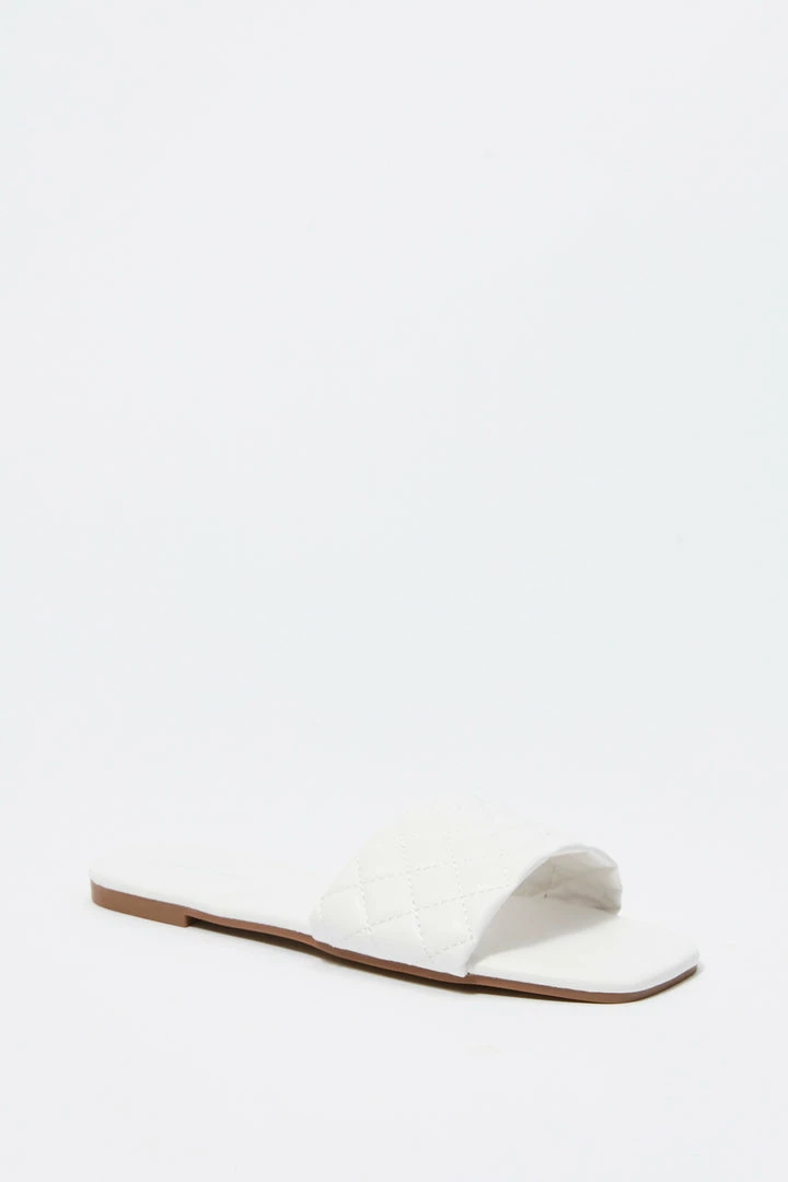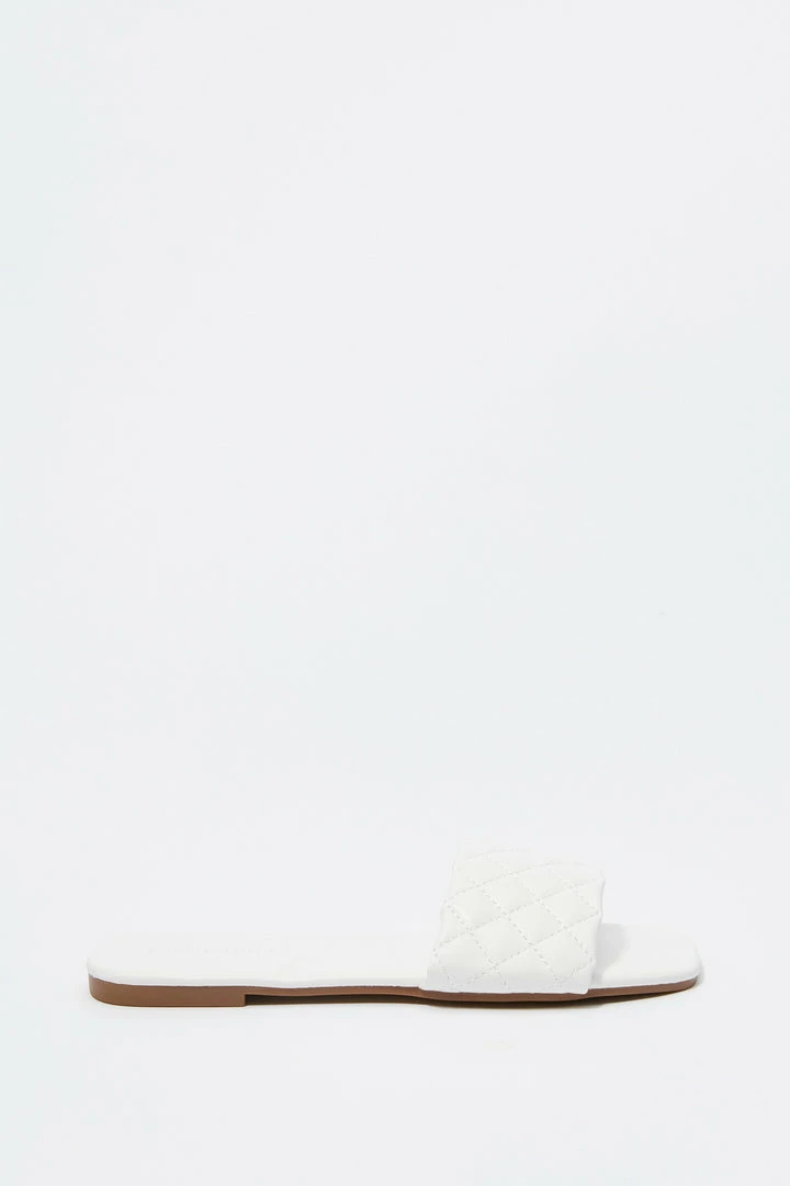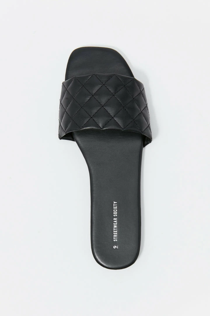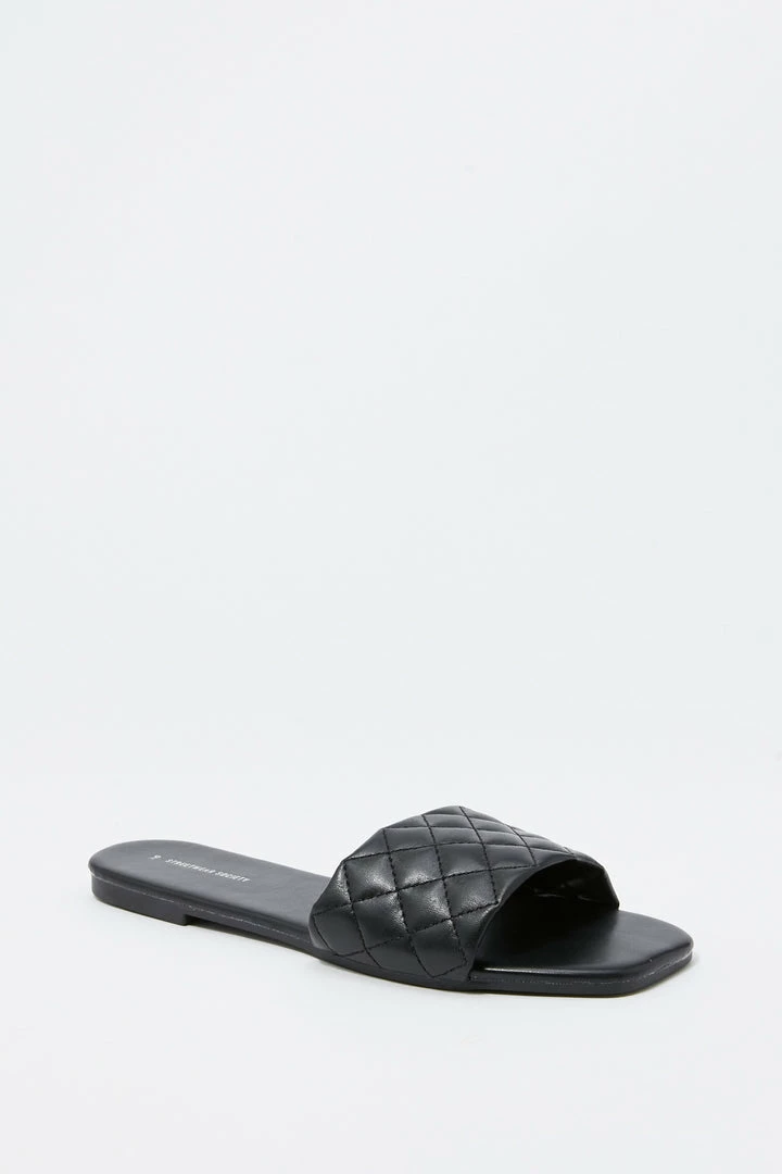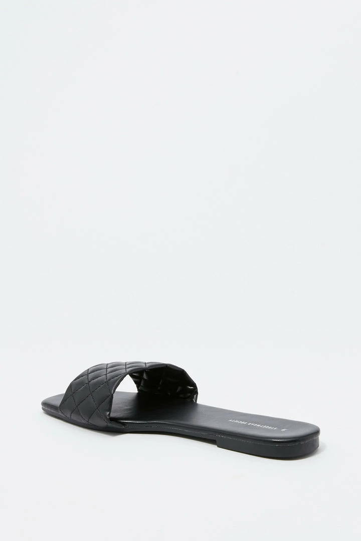 This footwear was quilt for a fashion Queen on the go! This shoe features faux-leather material, square toe, quilted band, flat sole and slide-on fit.