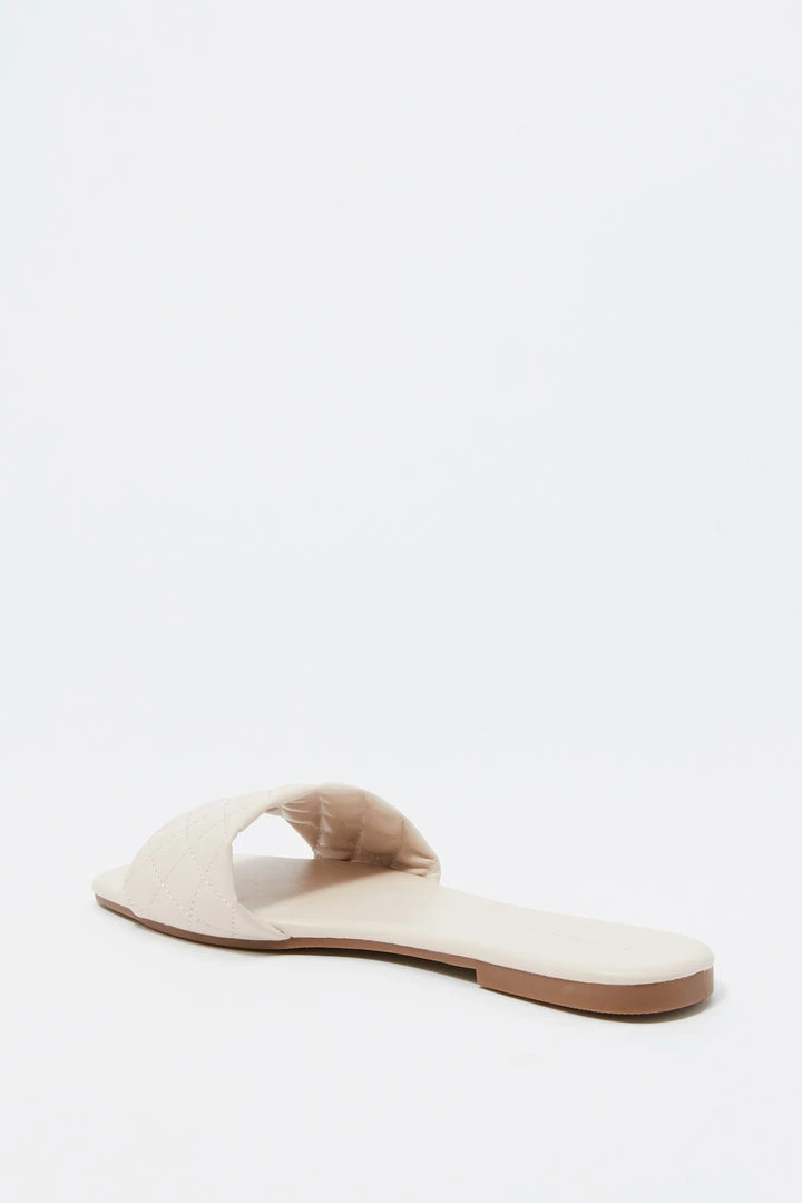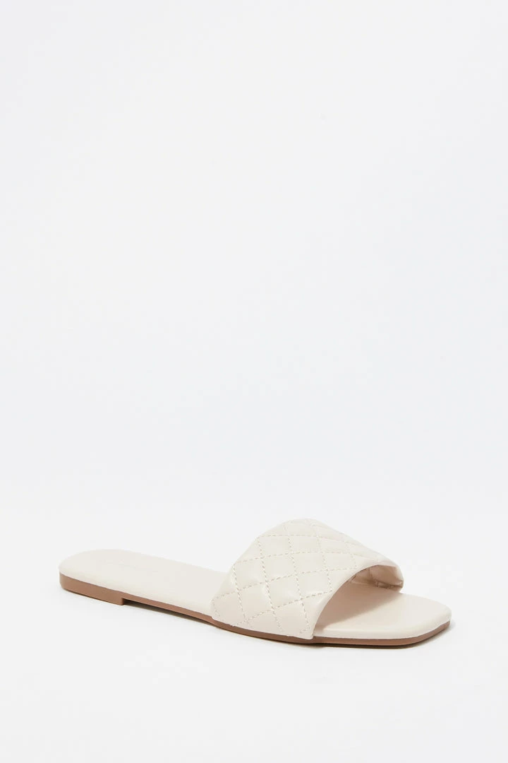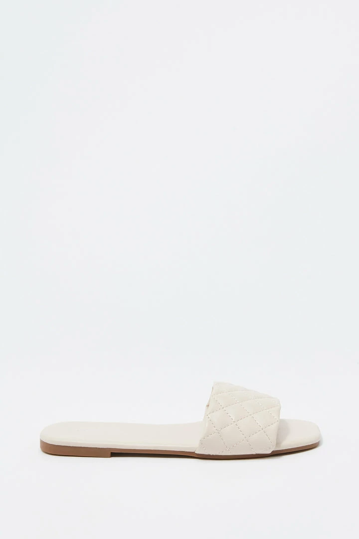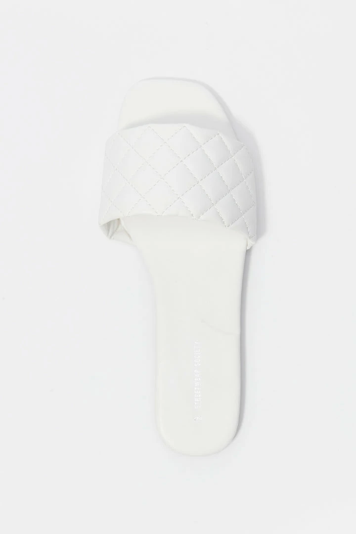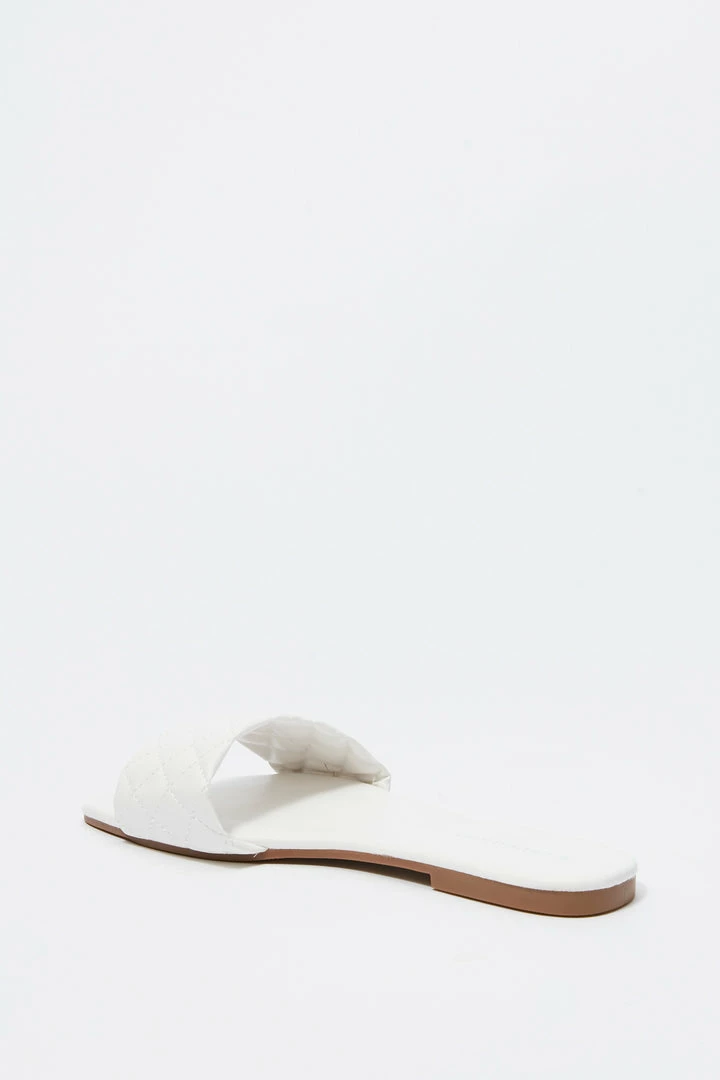 This footwear was quilt for a fashion Queen on the go! This shoe features faux-leather material, square toe, quilted band, flat sole and slide-on fit.
