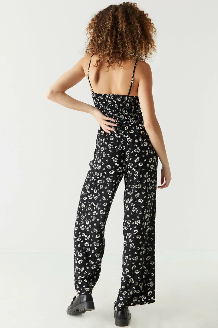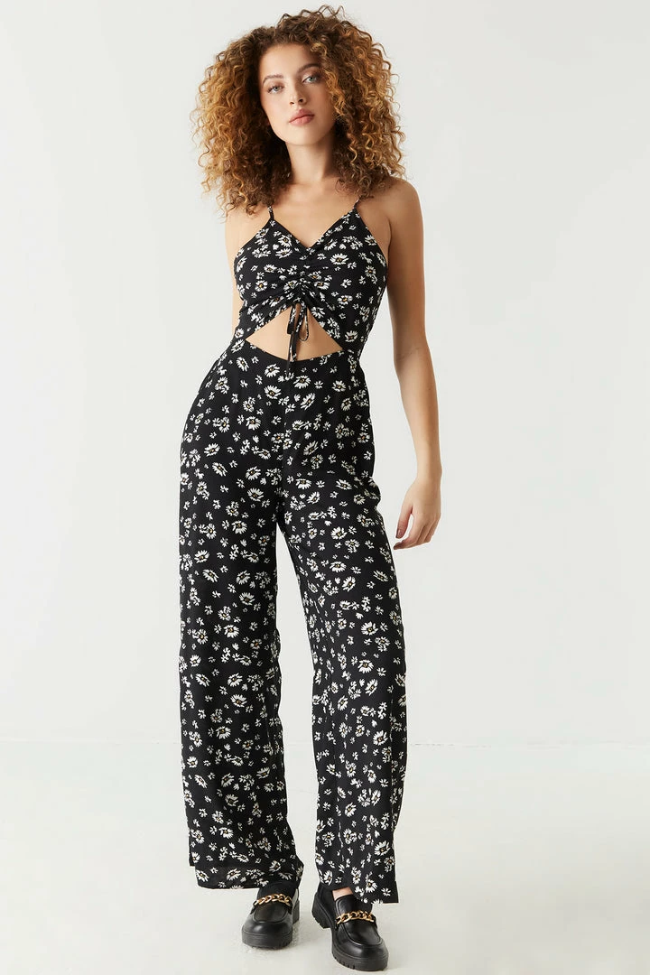 Jump into the day with confidence in this no fuss, ready for anything outfit that will have you styled in seconds! This jumpsuit features adjustable straps, wide leg, all over daisy print, ruched self-tie front, midriff cut-out and v-neckline. Size Runs Small.