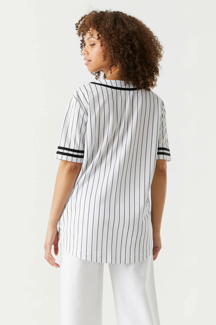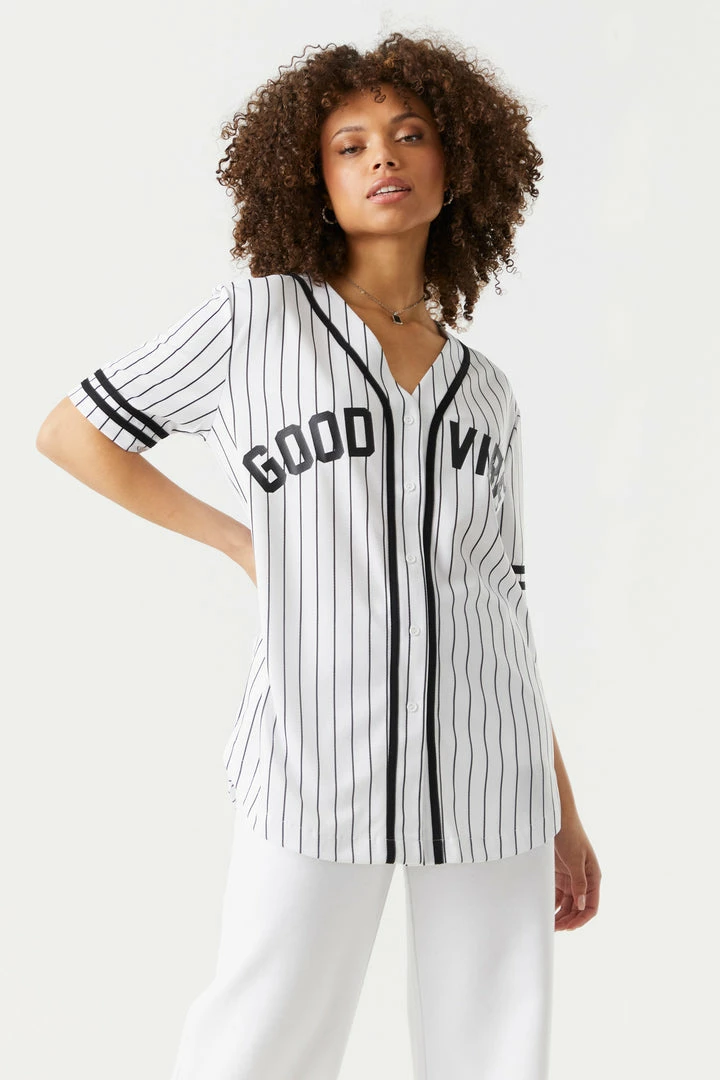 Forget the peanuts and cracker jacks… you just gained all-star status! In this baddie baseball jersey, he’ll be taking you out to more then the ballgame. This button-up features contrast stripe hem, button-up front, short sleeves, front Good Vibes graphic and v-neckline.Size Runs Small.
