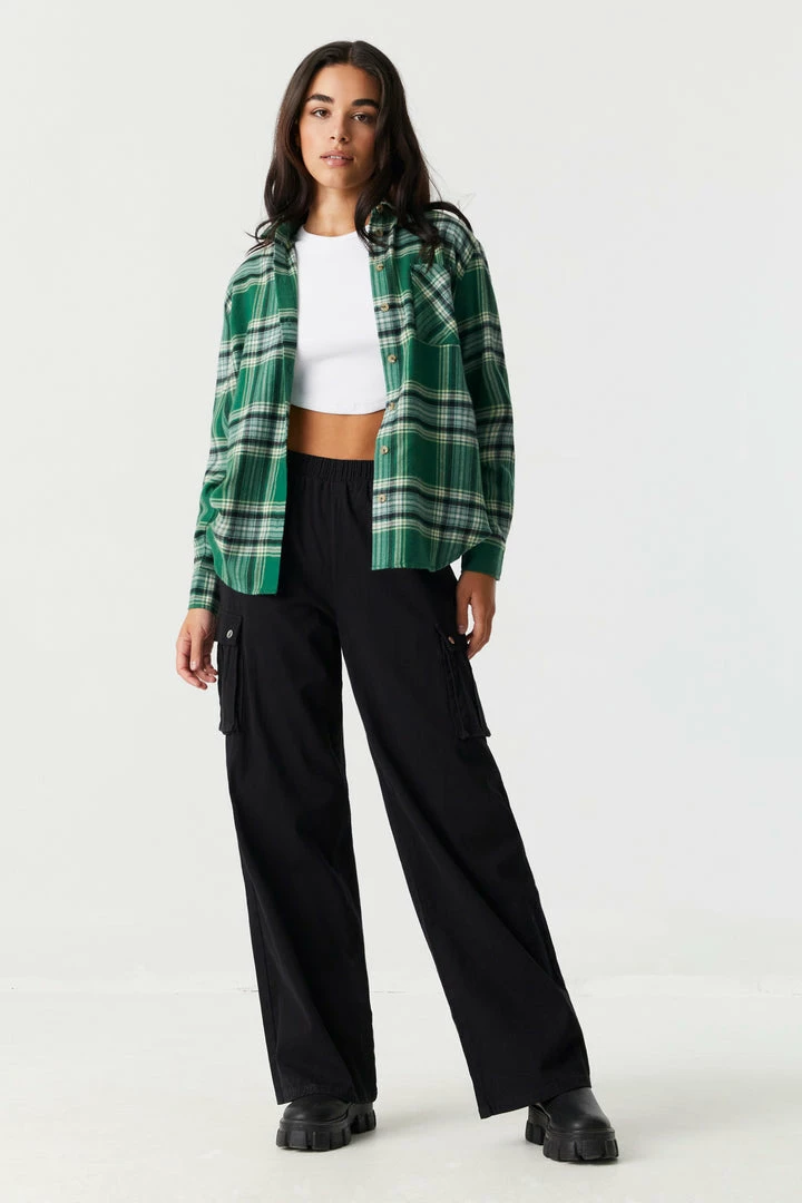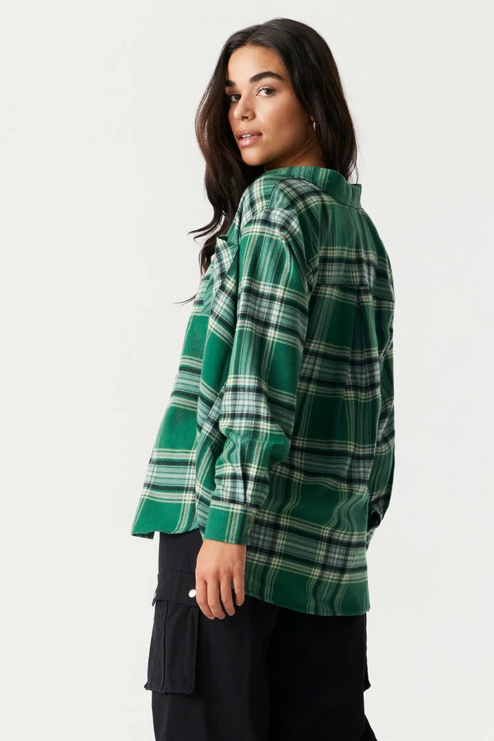 This lil lumber jack doesn’t need an axe! When the fit is this fierce everything just falls for you. This top features blue green print, long sleeves, button-up front, single pocket and flannel material. Size Runs Small.