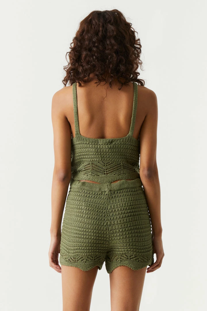 Do knit miss your opportunity to get your hands on this seasons sweetest loungewear. This short features self-tie drawstring waist, high-rise waist and crochet knit material. Size Runs Small. Finish the fit with the Crochet Button-Up Cropped Cami.