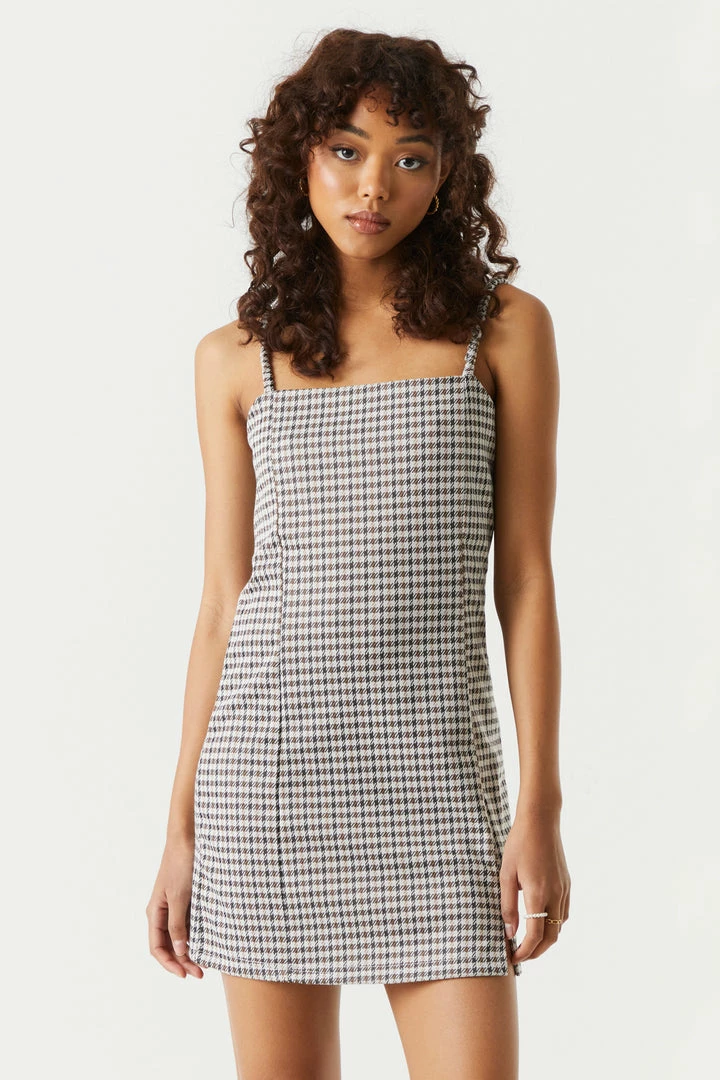 We are falling hard for darling dresses and this mini has stolen our hearts! This dress features open back, all over houndstooth print, mini left leg slit and square neckline. Size Runs Small.