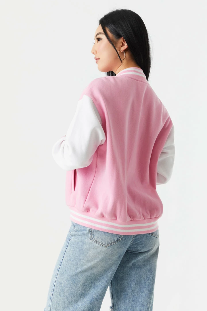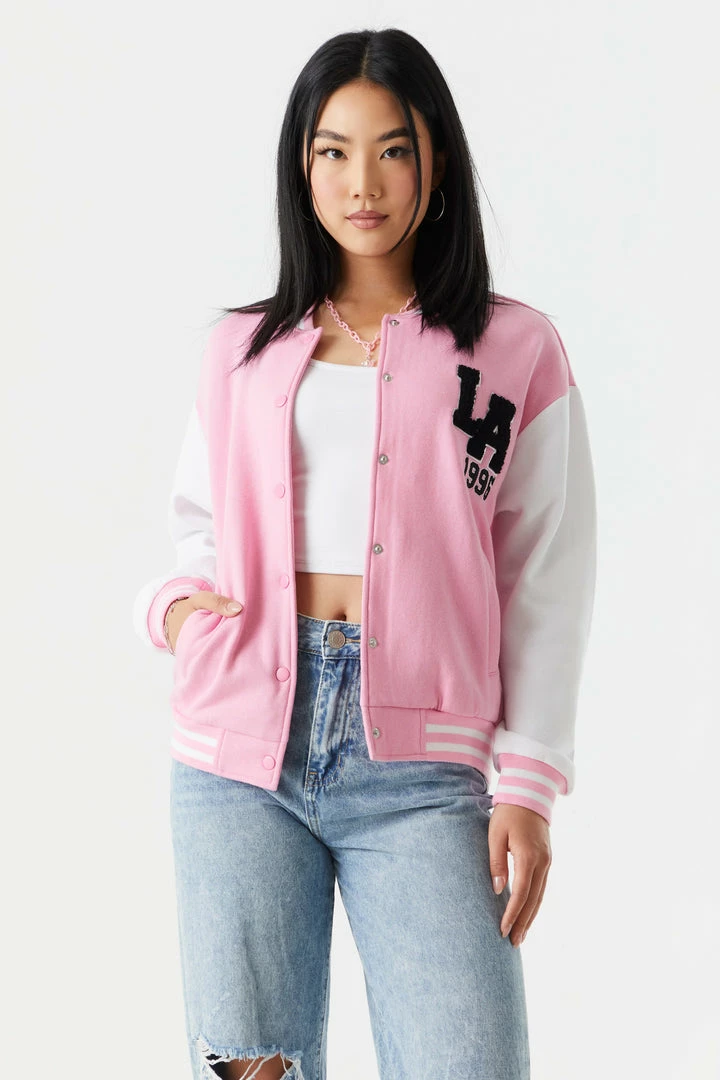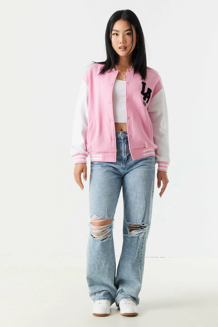 Embrace your inner main character and make a statement in this iconic varsity fit. This jacket features contrast cuffs and hem, button-up front, colour block sleeves, two pockets and chenille embroidered LA varsity front graphic. Size Runs Small.
