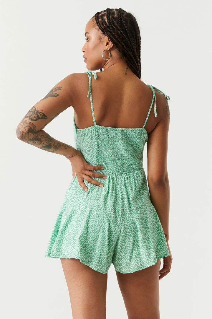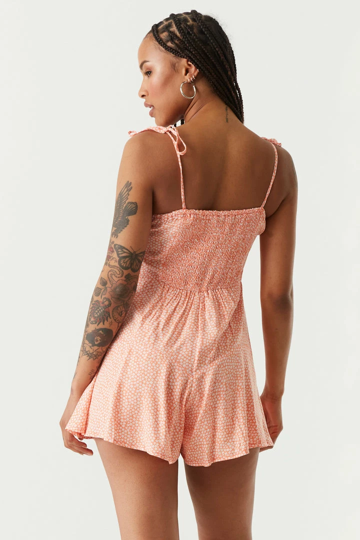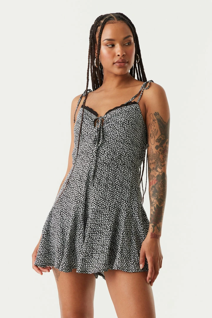 Spring into warmer weather with this floral fit. This romper features lace trim, all over floral print, self-tie bust, self-tie straps and mini fit. Size Runs Small.