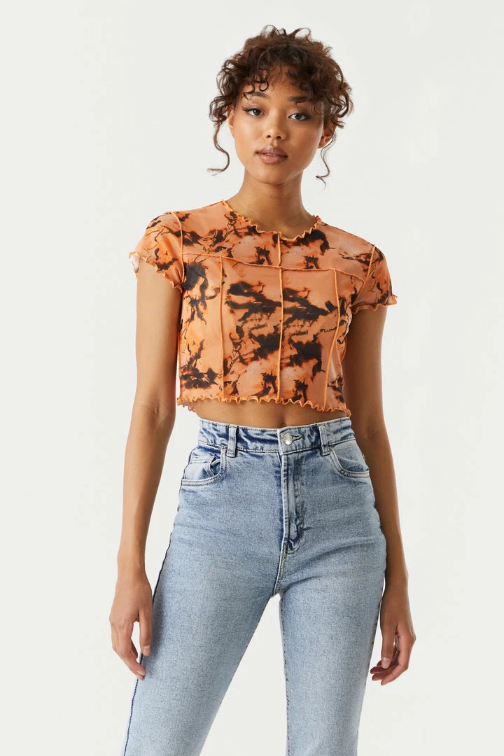 A match made in mesh heaven! Fall in love with this layered look. This t-shirt features mesh material, exposed seam, lettuce hem, orange marble print and cropped fit. Size runs small.