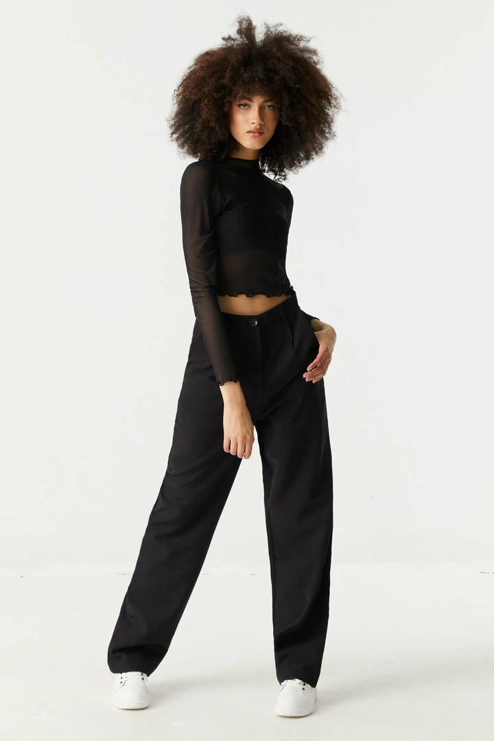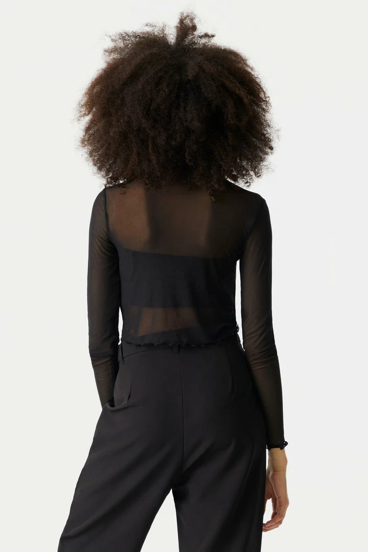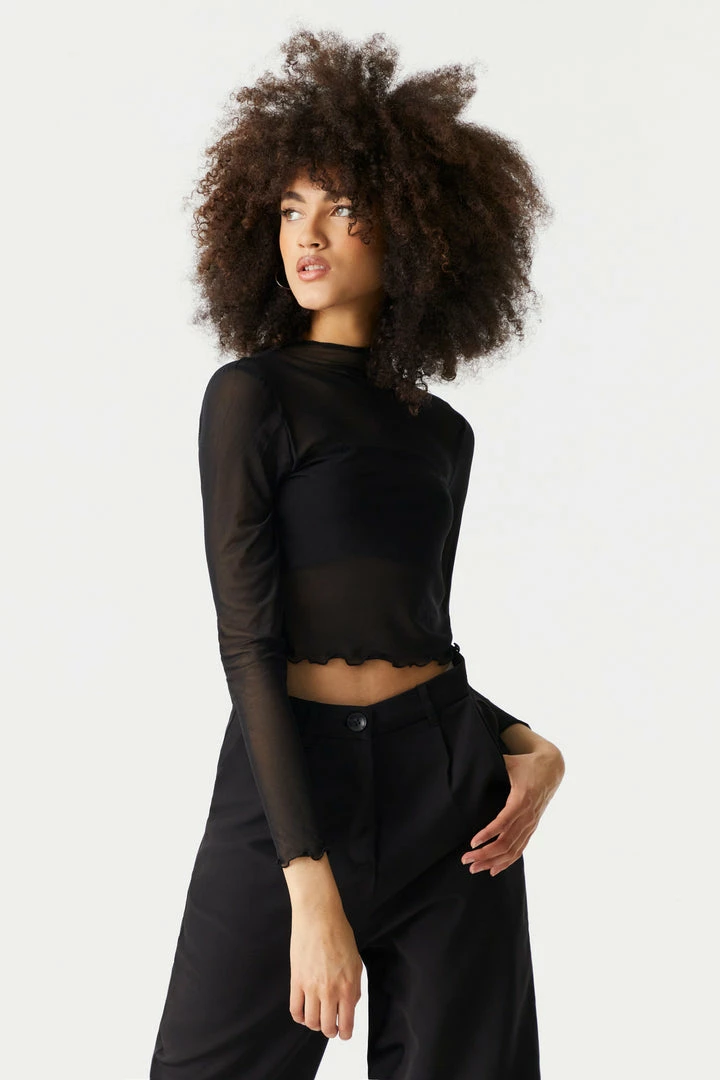 You’ll mesh will with this top! Add some edge to your top rotation with this mod piece. This top features lettuce hem, mesh material, cropped fit, mock neck and long sleeves. Size Runs Small.