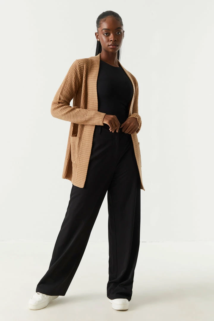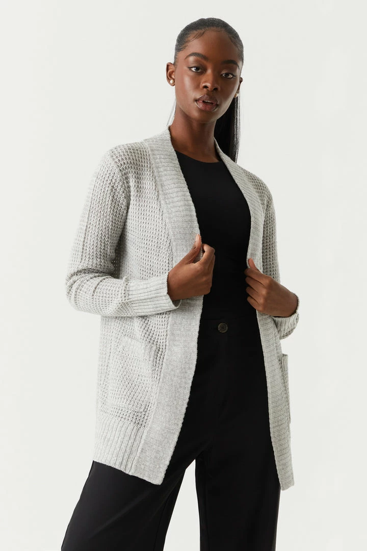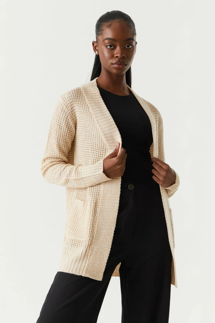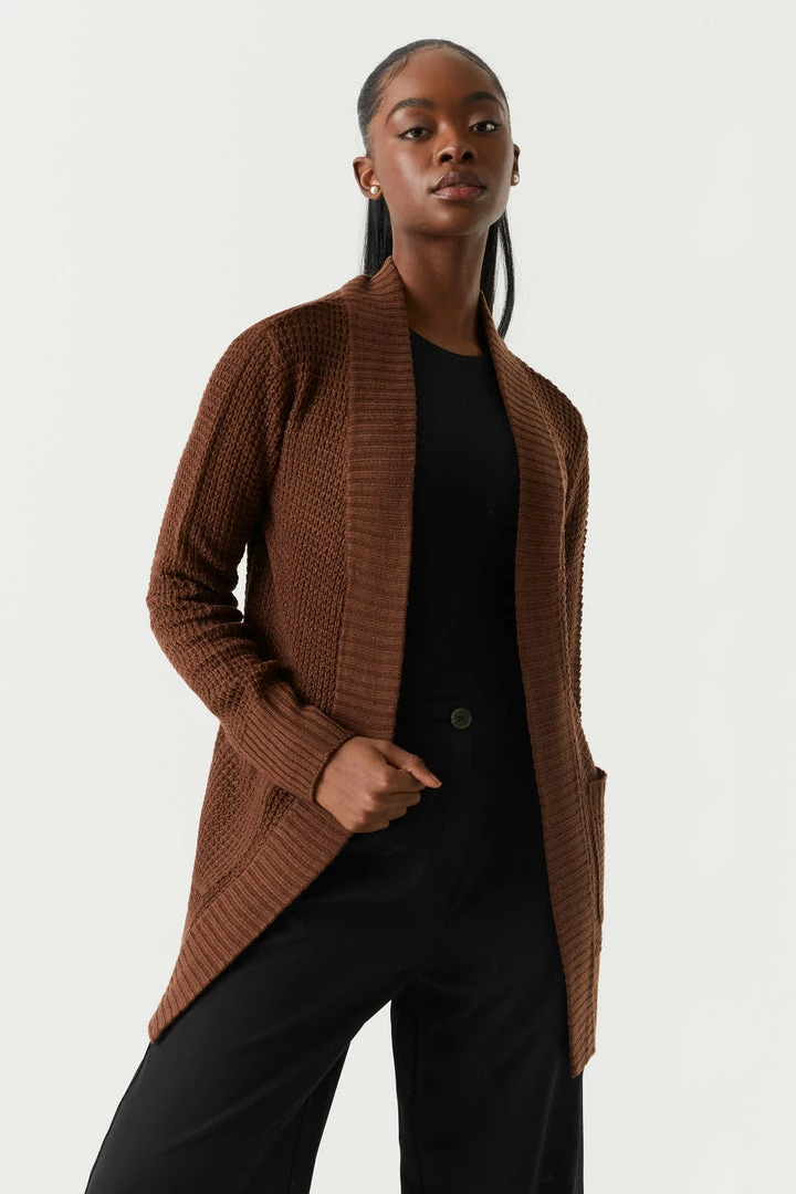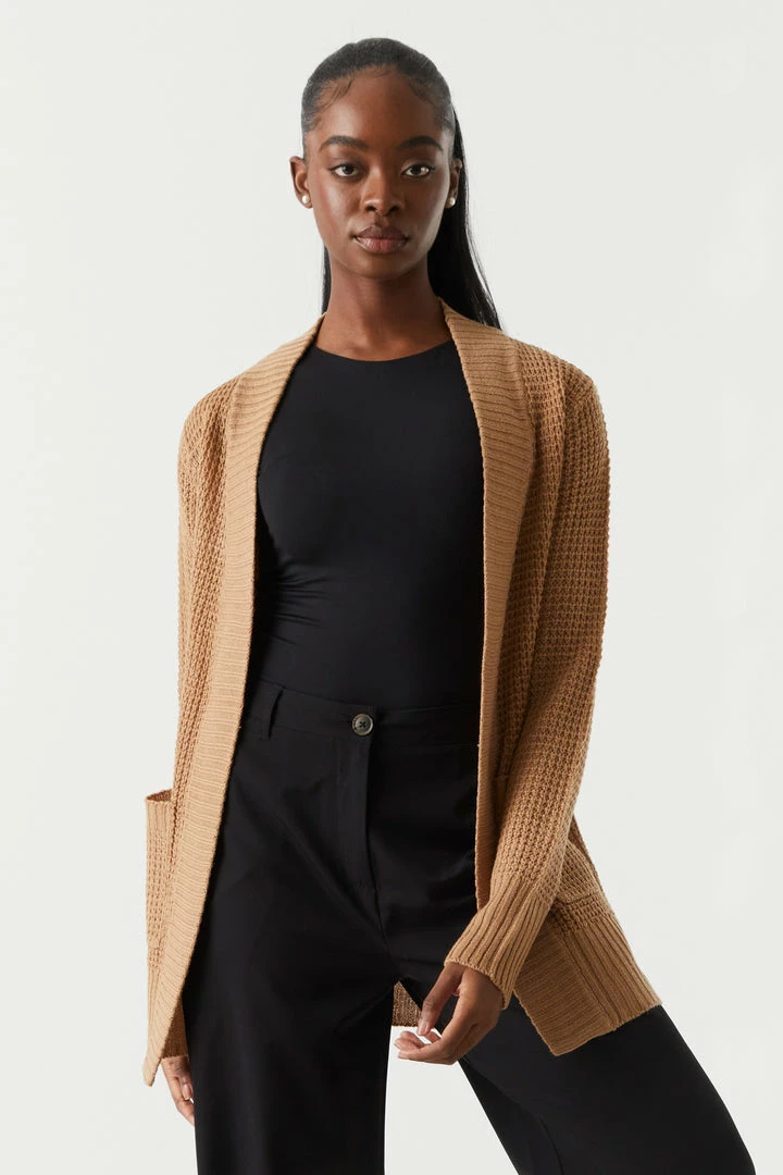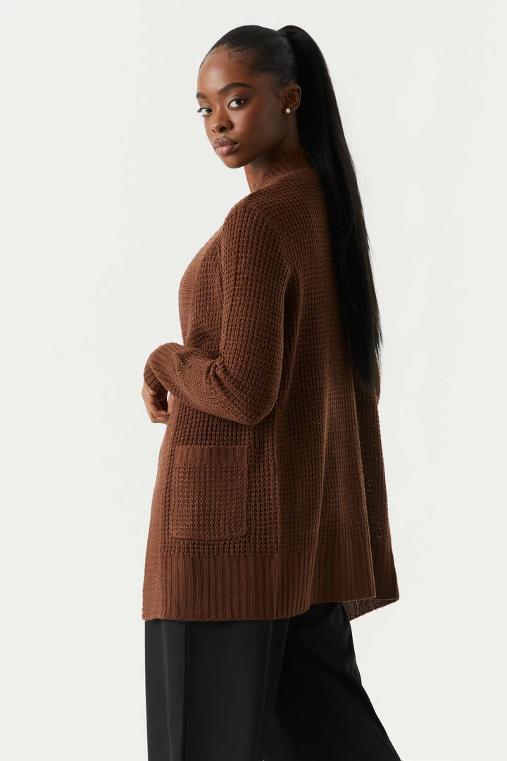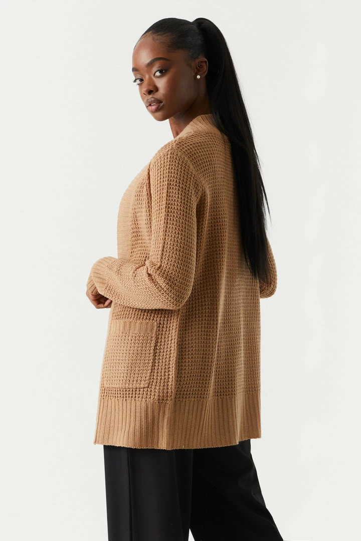 Breakfast is the most important meal of the day and today we are having waffles! This cardigan features open front, long sleeves, ribbed knit hem and two large pockets.